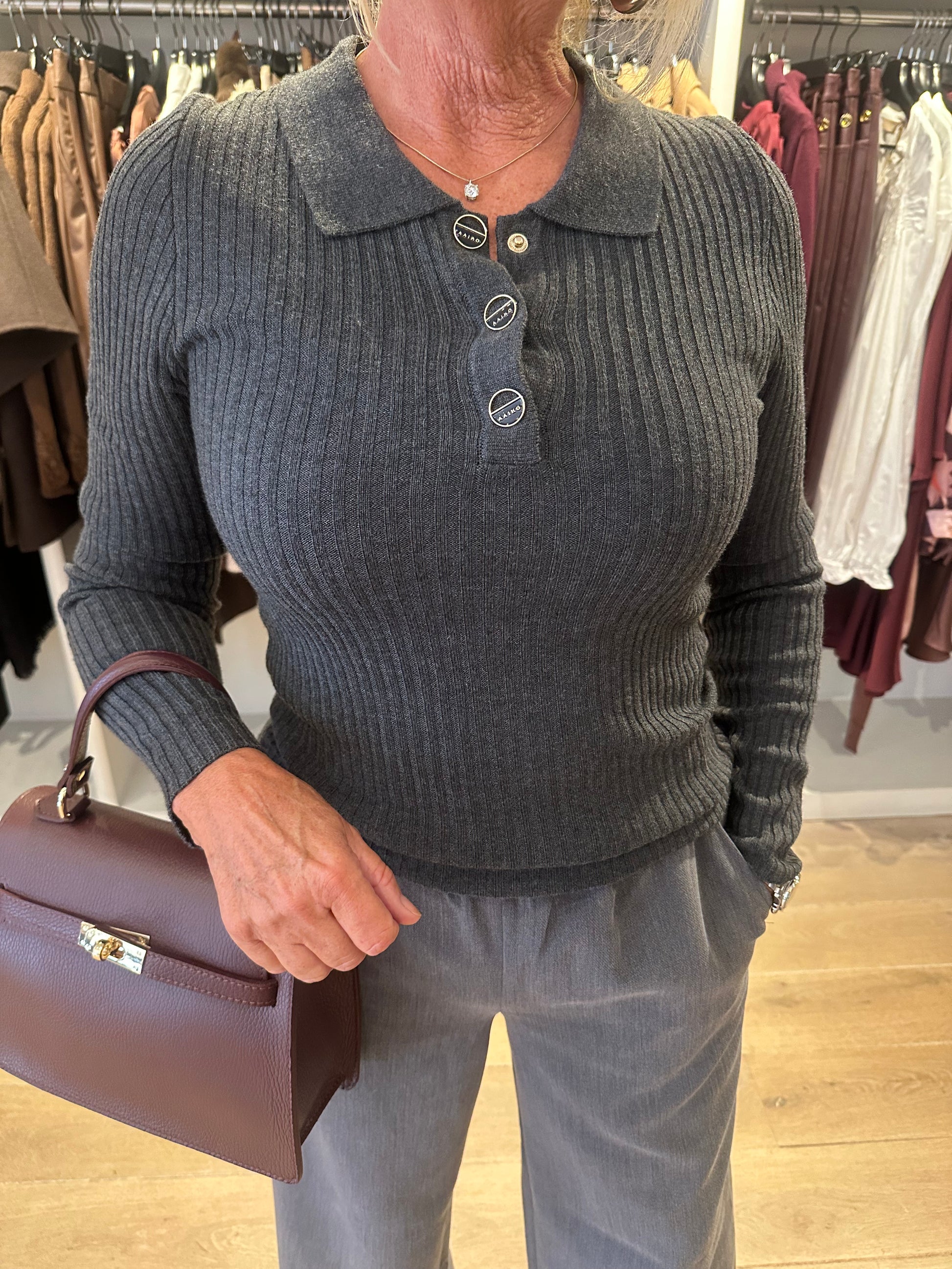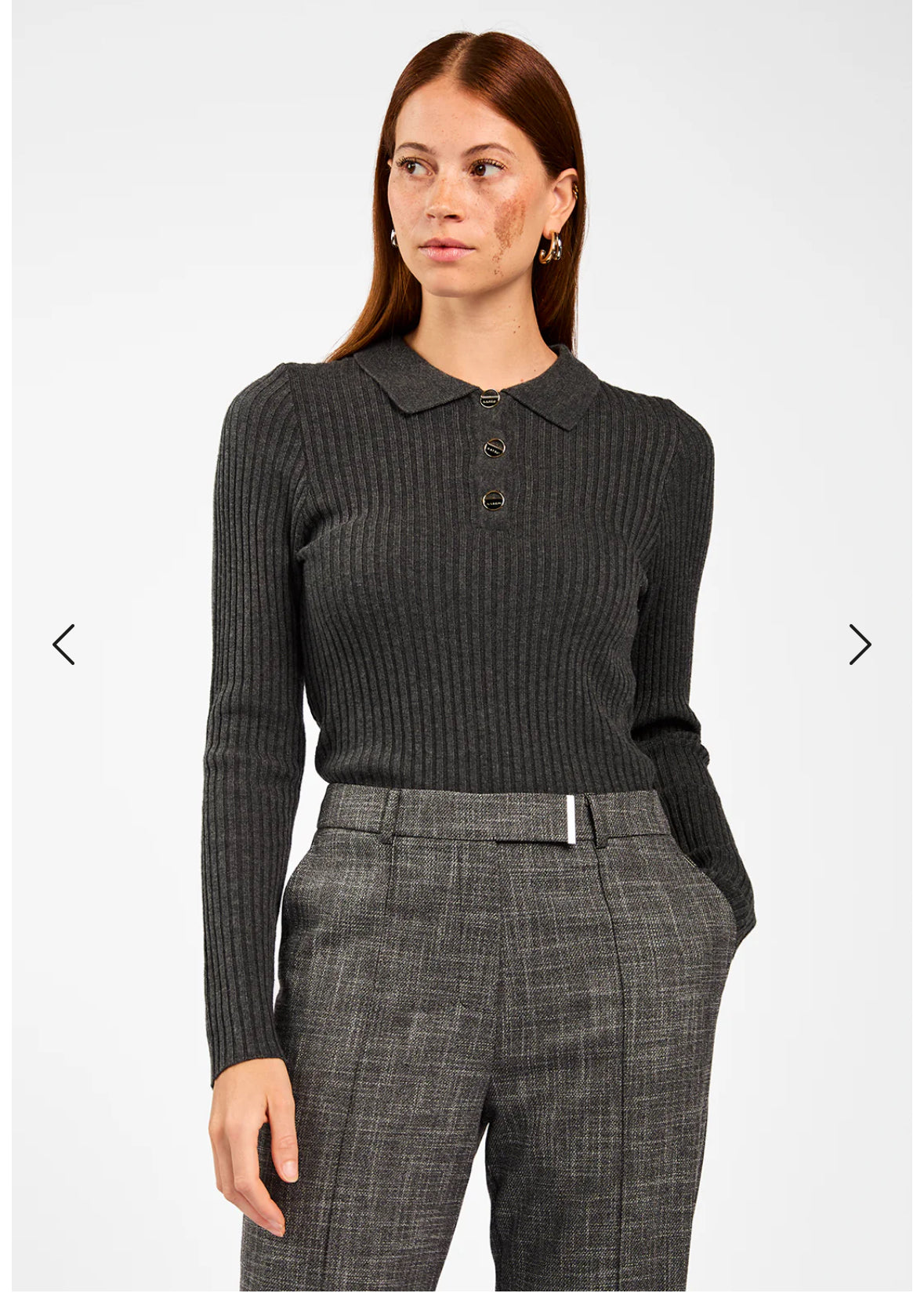 De Flores top is een mooi aansluitende trui gemaakt van een zachte, geribde stof die mooi om het lichaam valt. De klassieke kraag en de gouden knopen geven een elegante touch aan het ontwerp. Perfect voor zowel een casual als zakelijke look. Valt op maat.