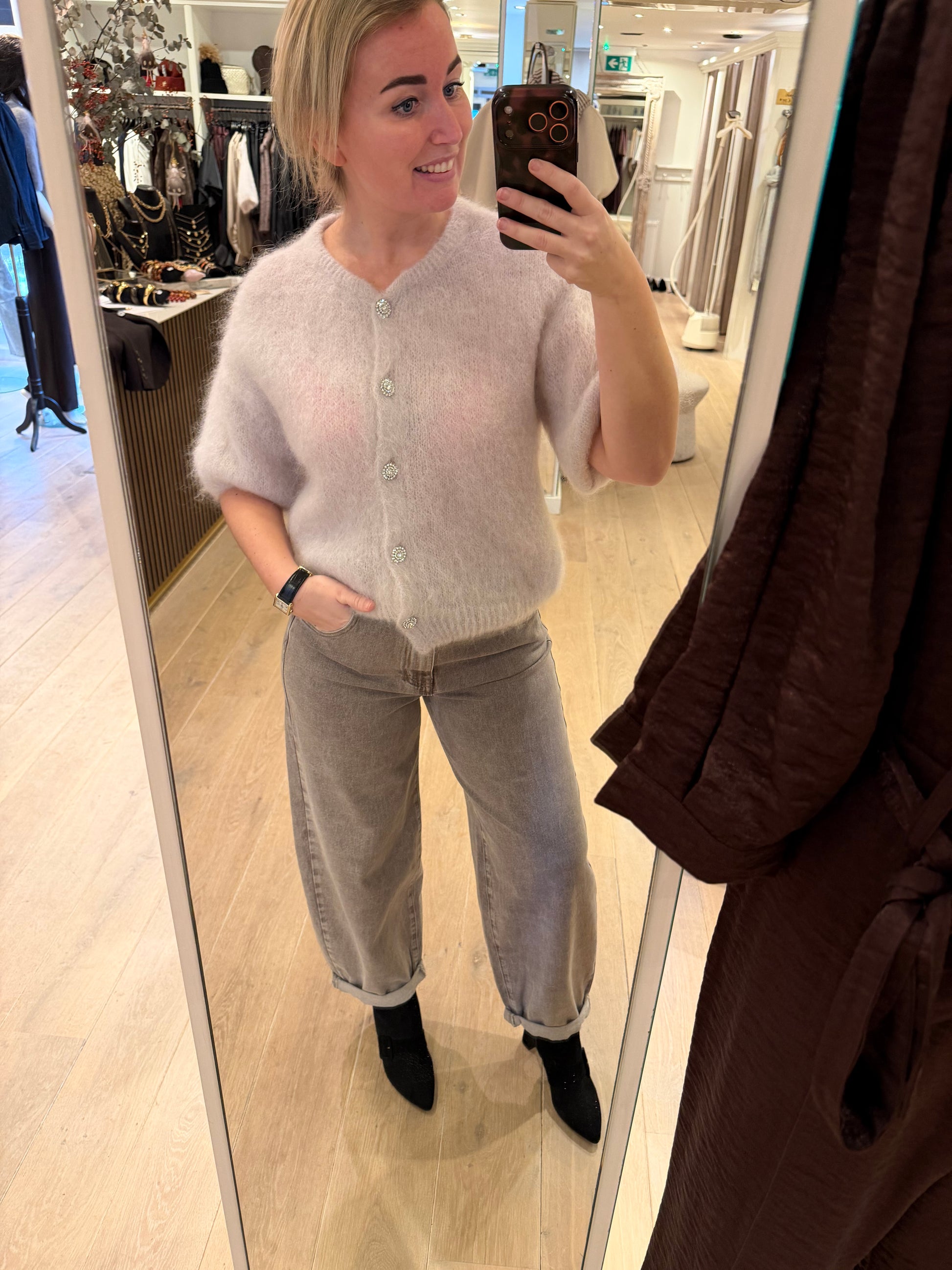 Mooie barrel jeans in een verwassen taupe/ licht bruine wassing. Super stoer en eindeloos te combineren! Met lekker stretch. Maten vallen normaal, Patty draagt maat 38.