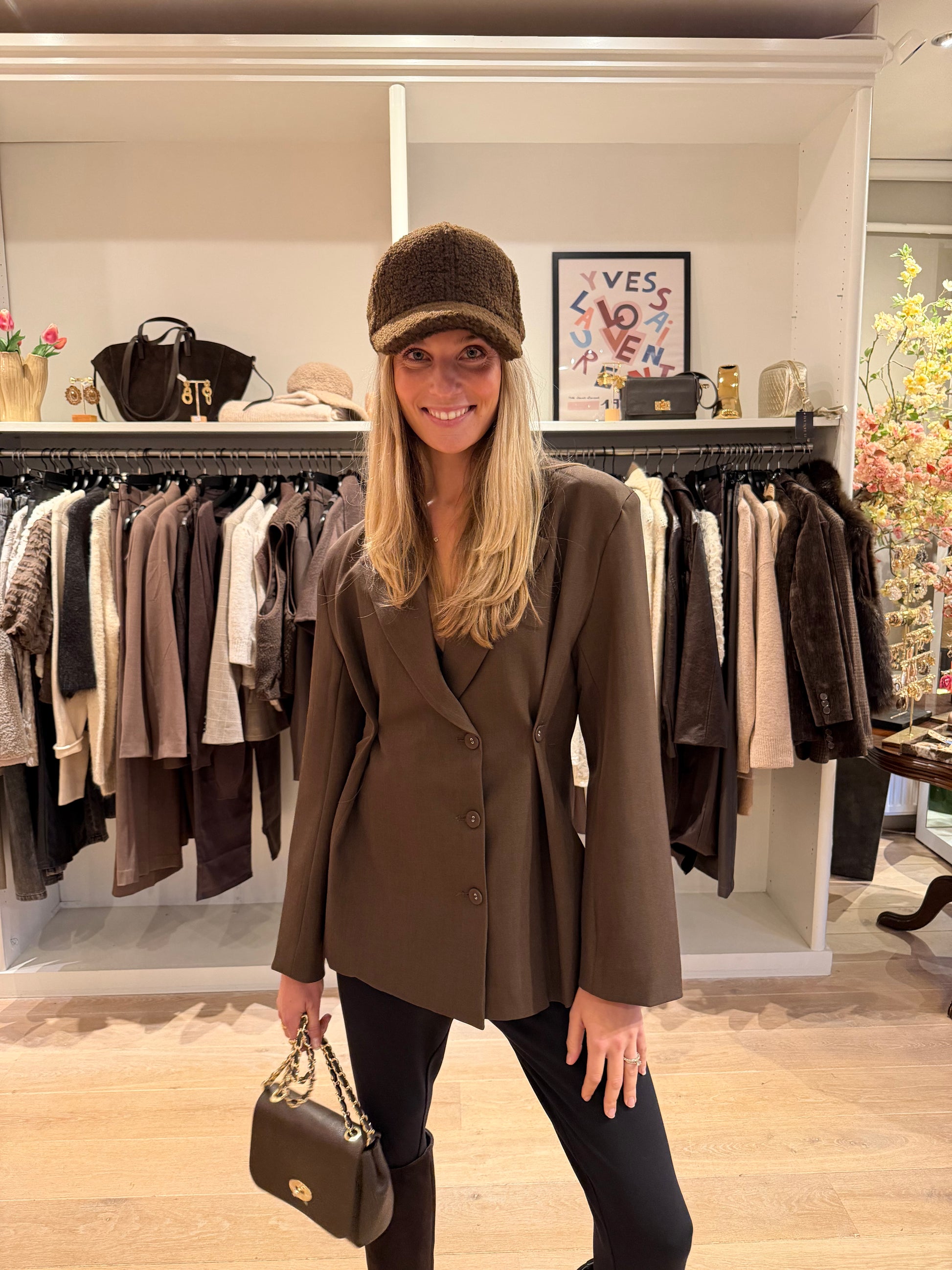 Super gave donker bruine blazer met knoop details die tailleren. Maat s/m of m/l. Valt op maat.