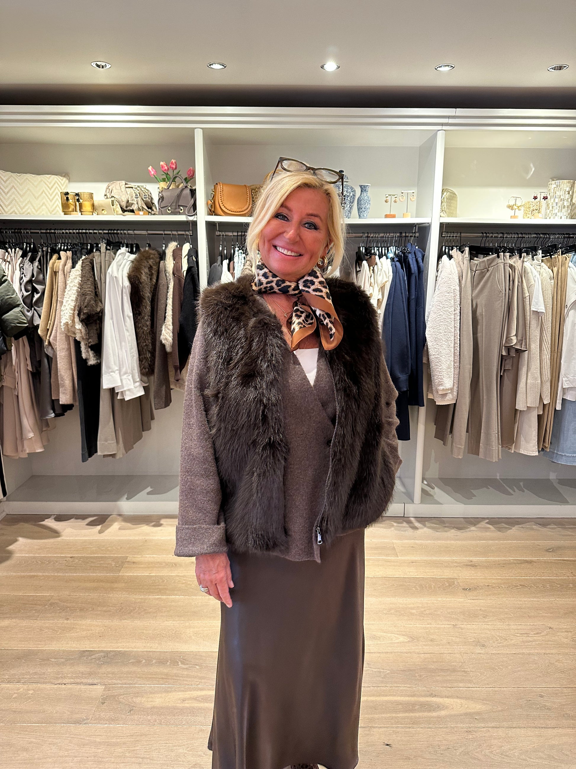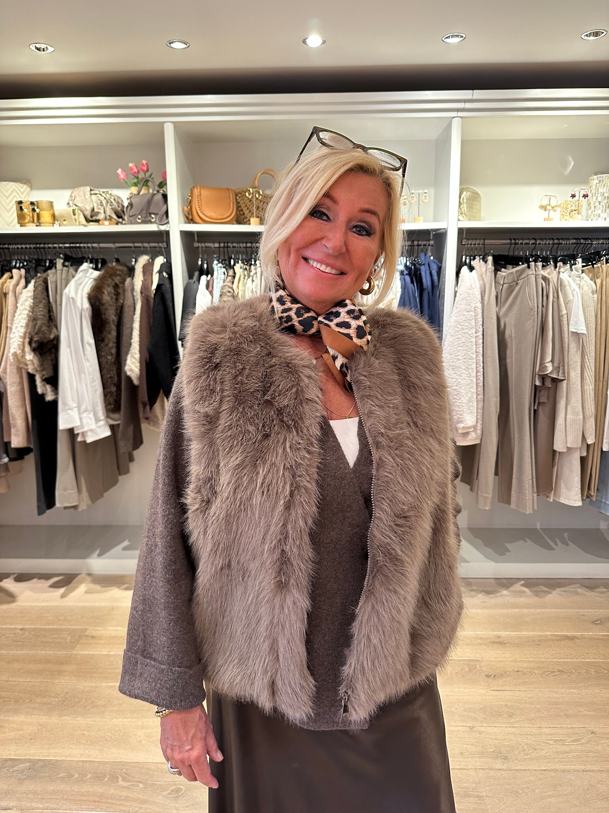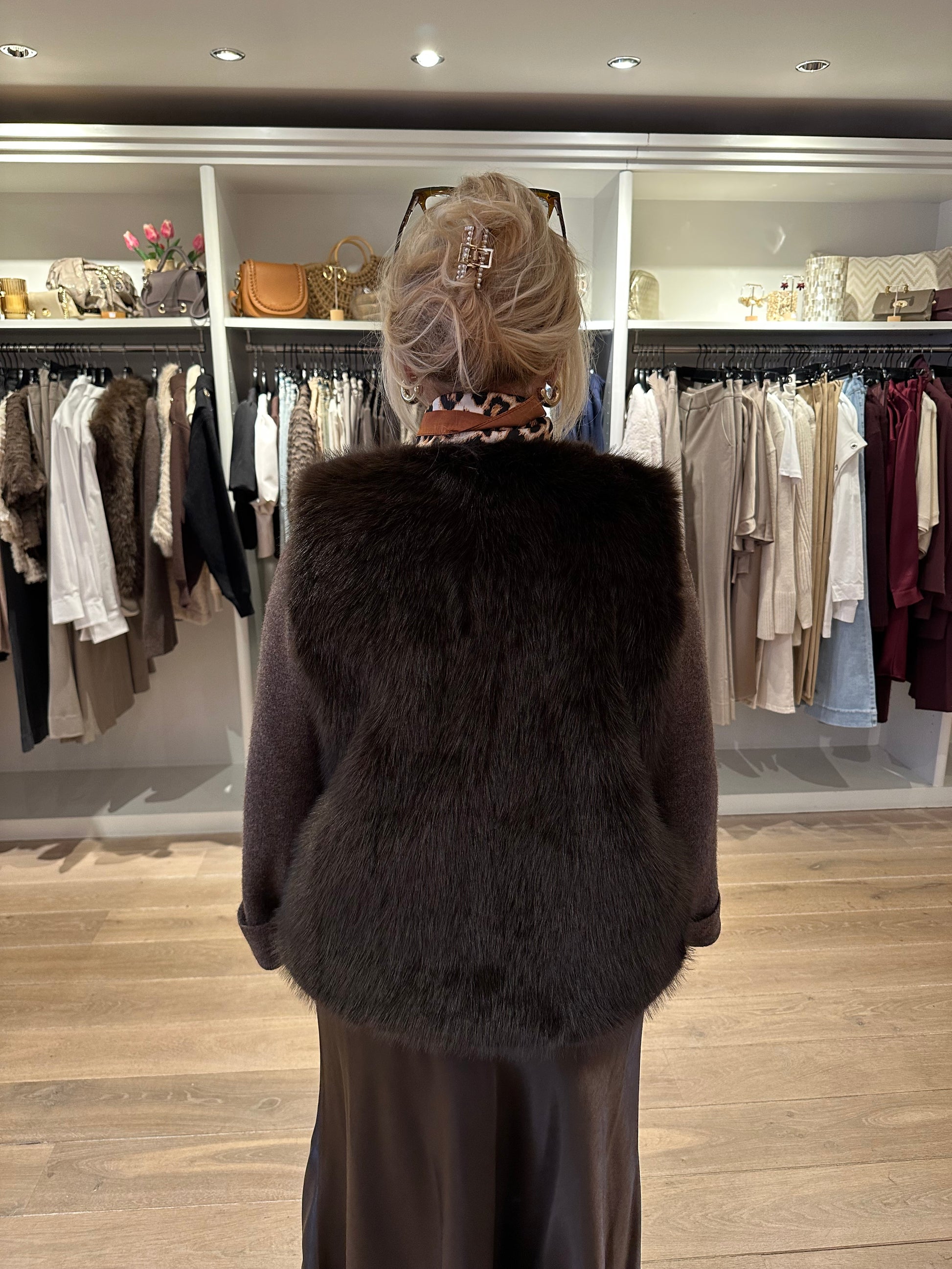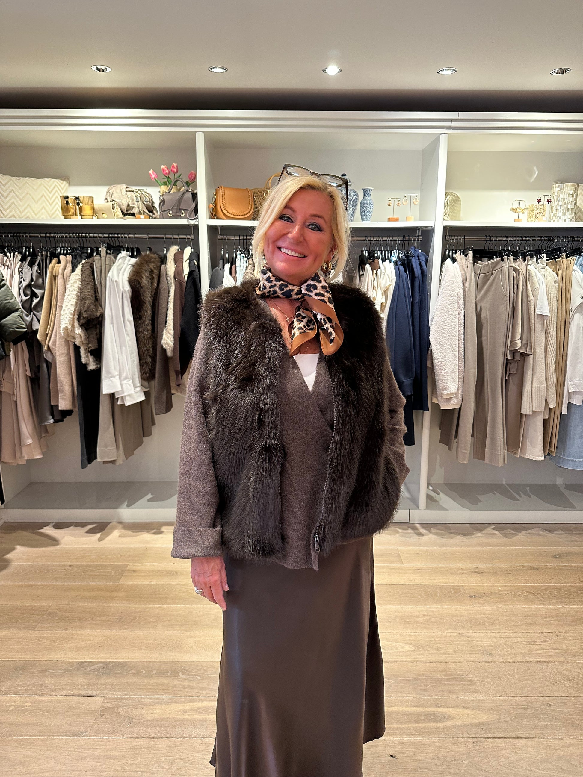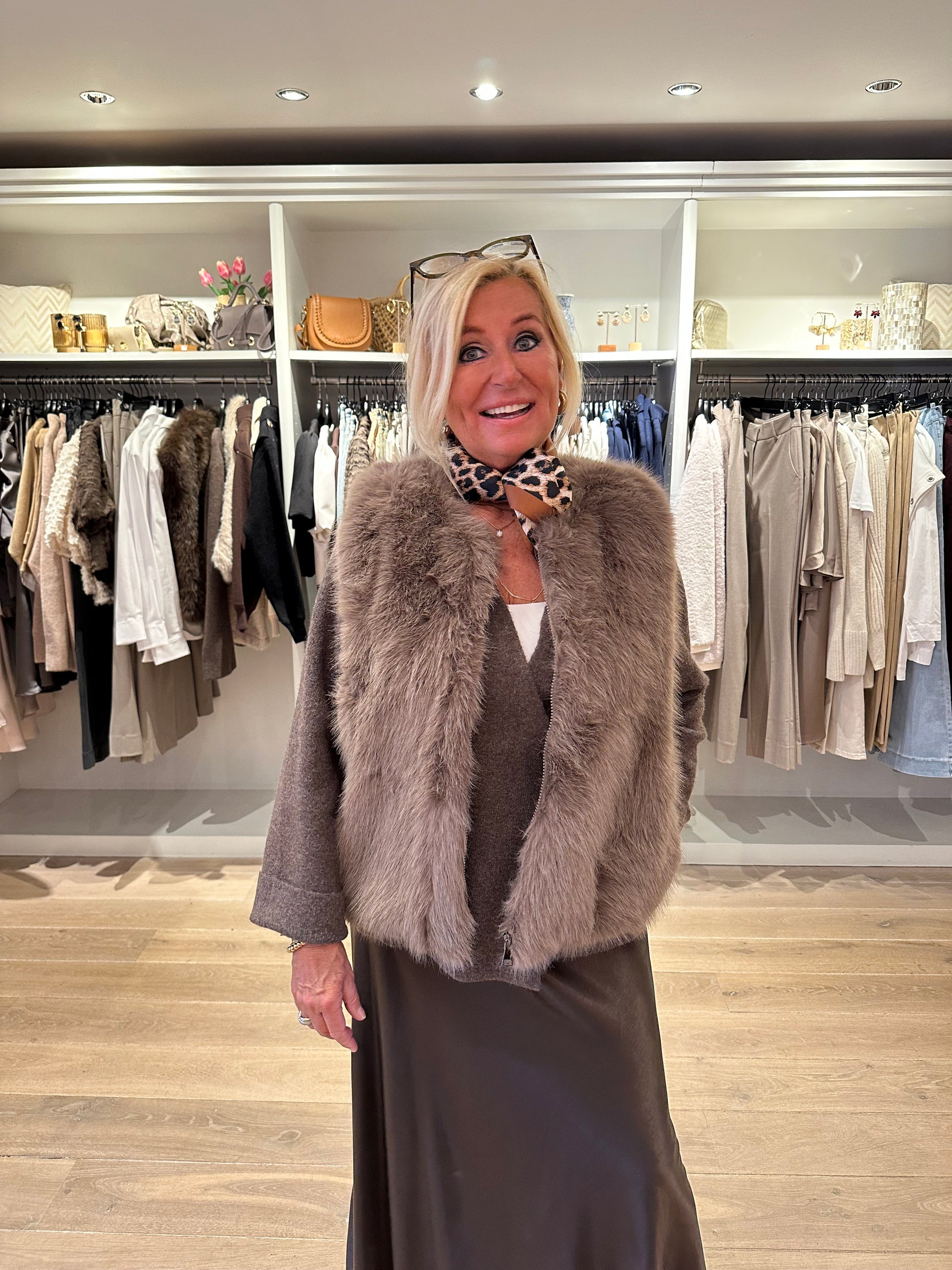 Hoe leuk is deze bodywarmer! Met rits en zakken. One size te dragen tm een goede maat 40/ kleine 42. In de mooie donkerbruine kleur en taupe.