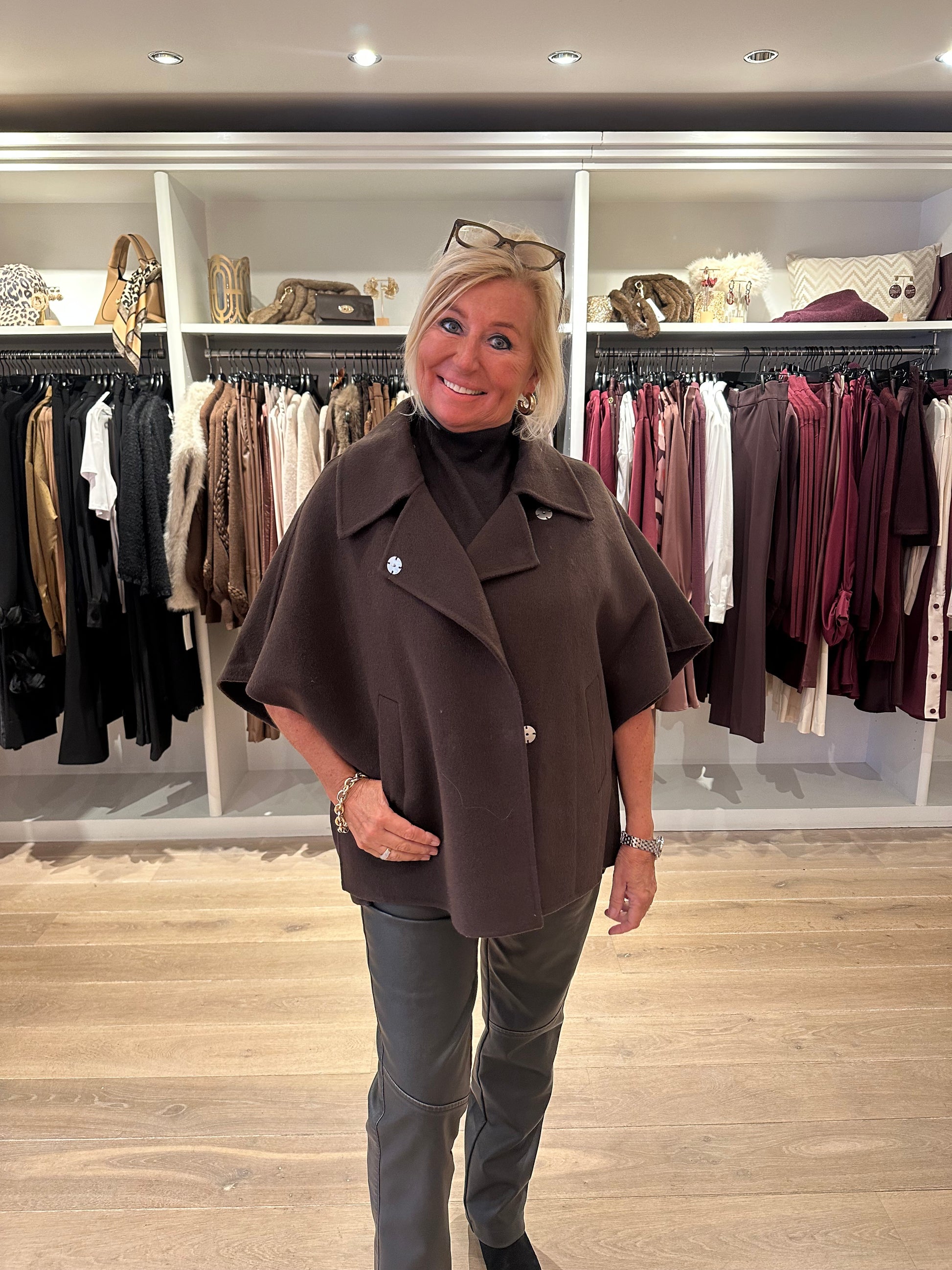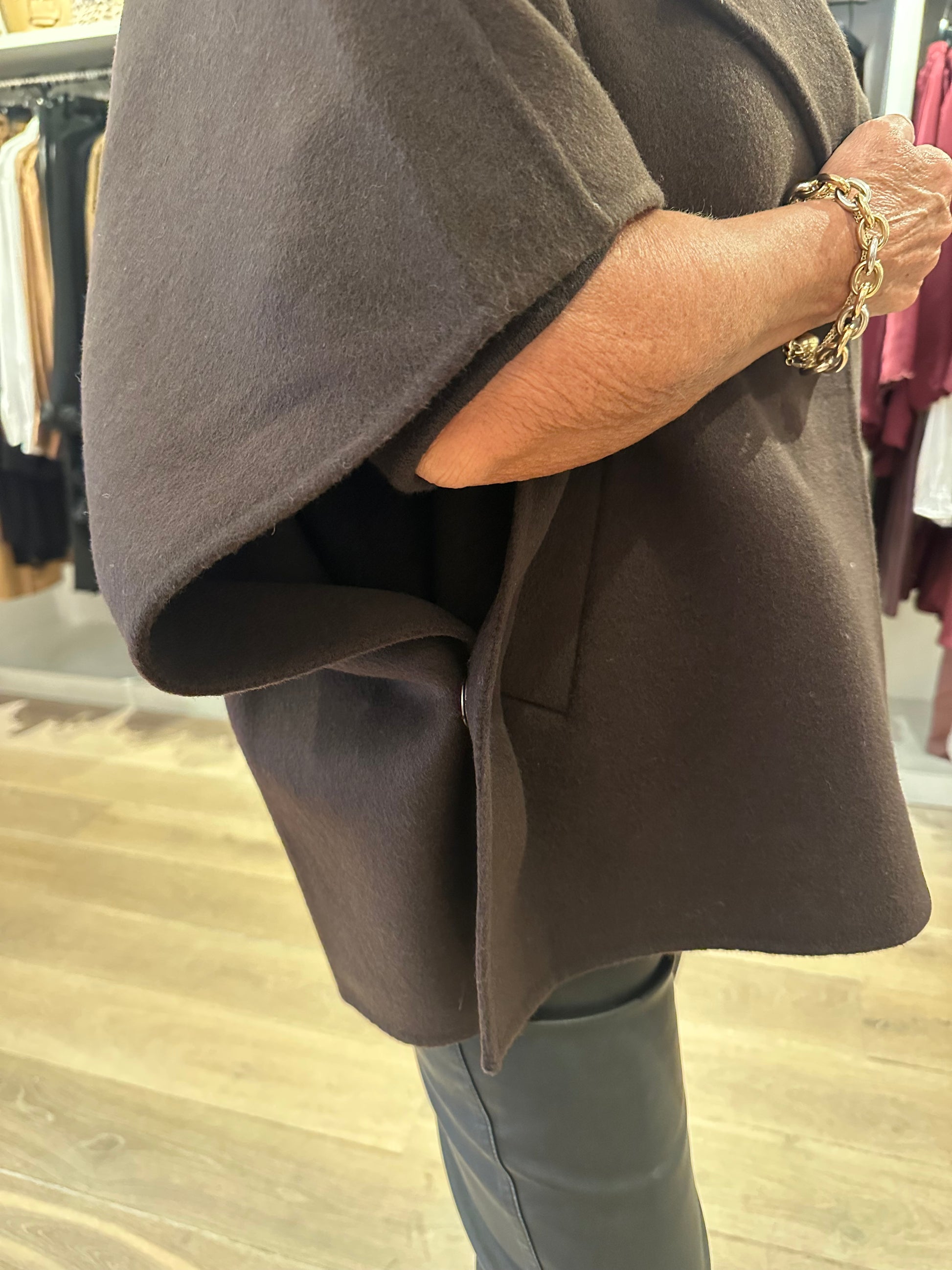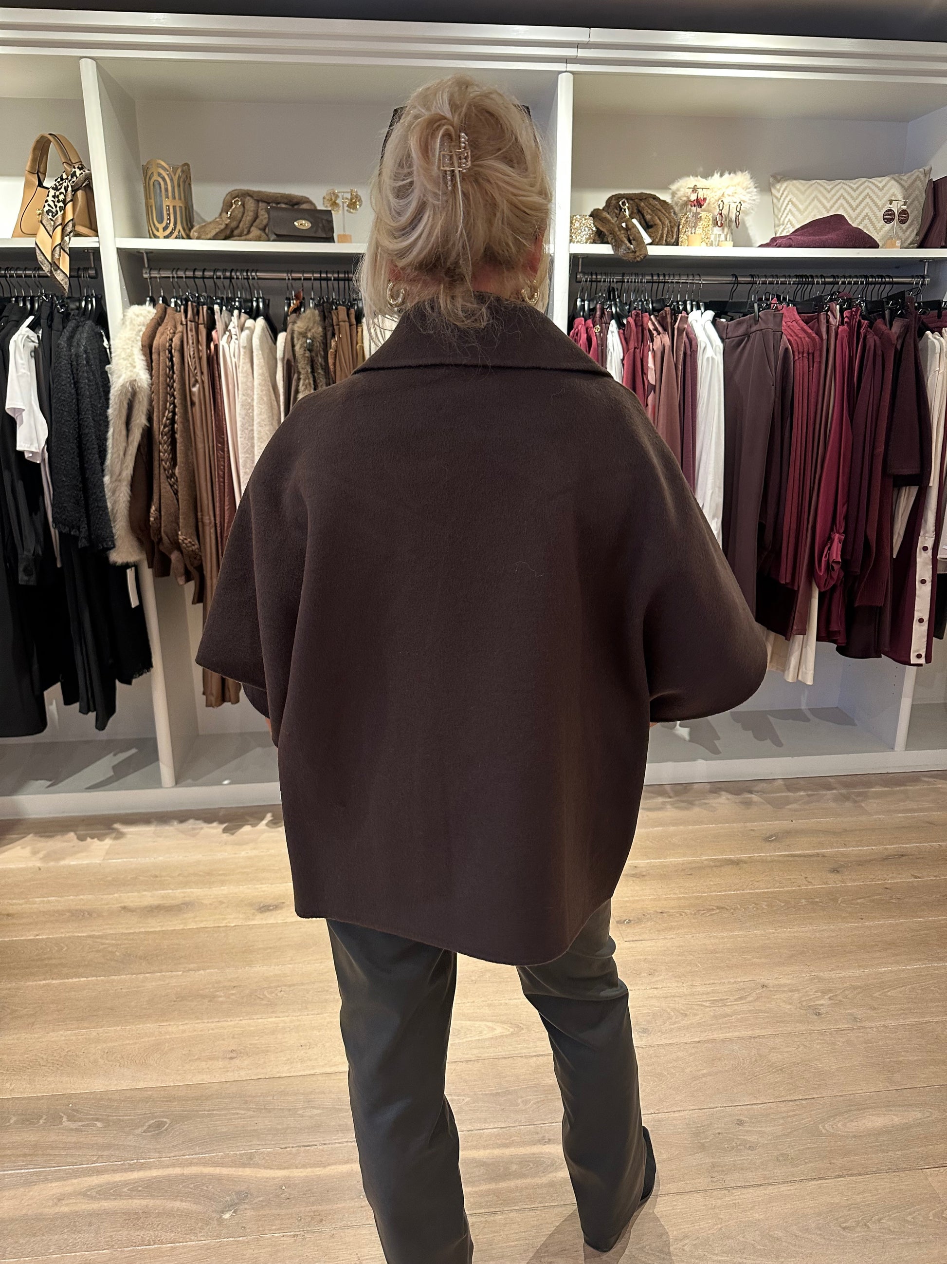 Super mooie cape van 70% wol. Donkerbruin, one size te dragen tm maat 44