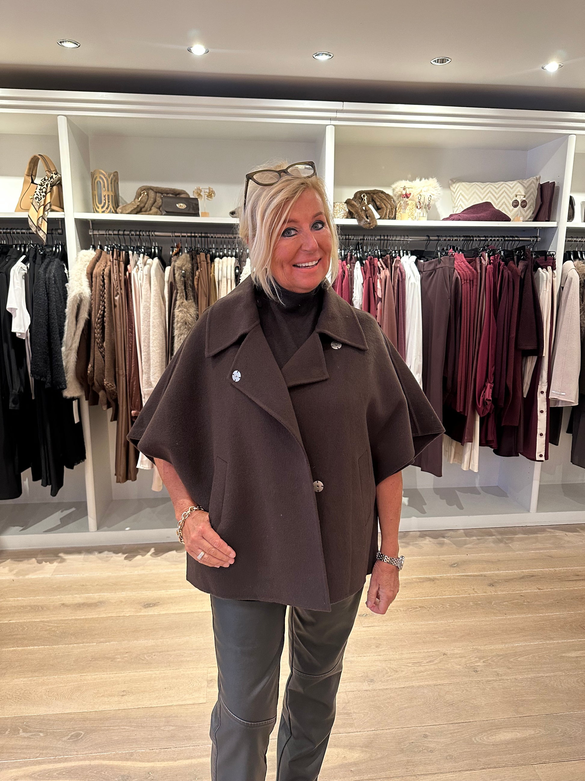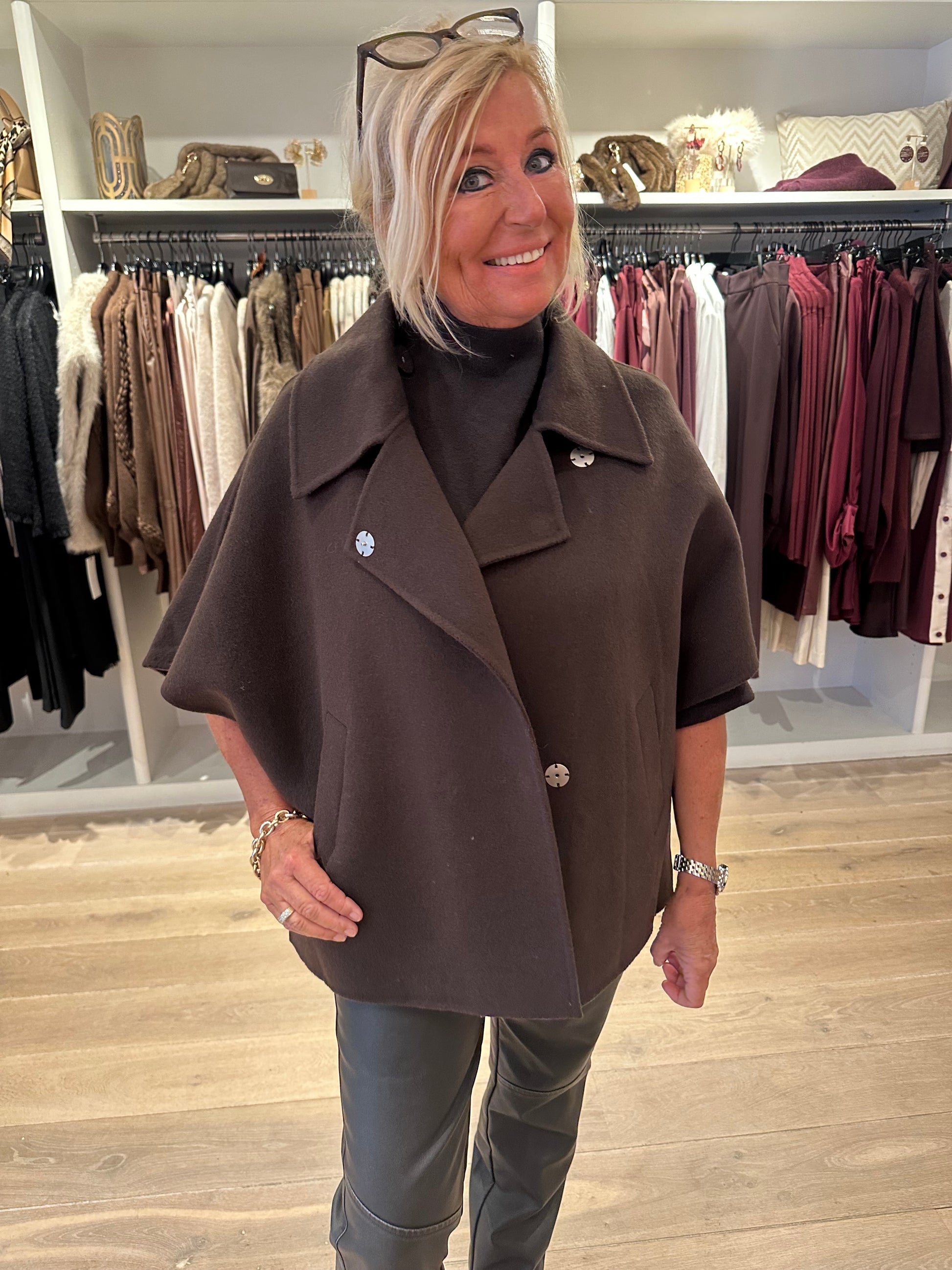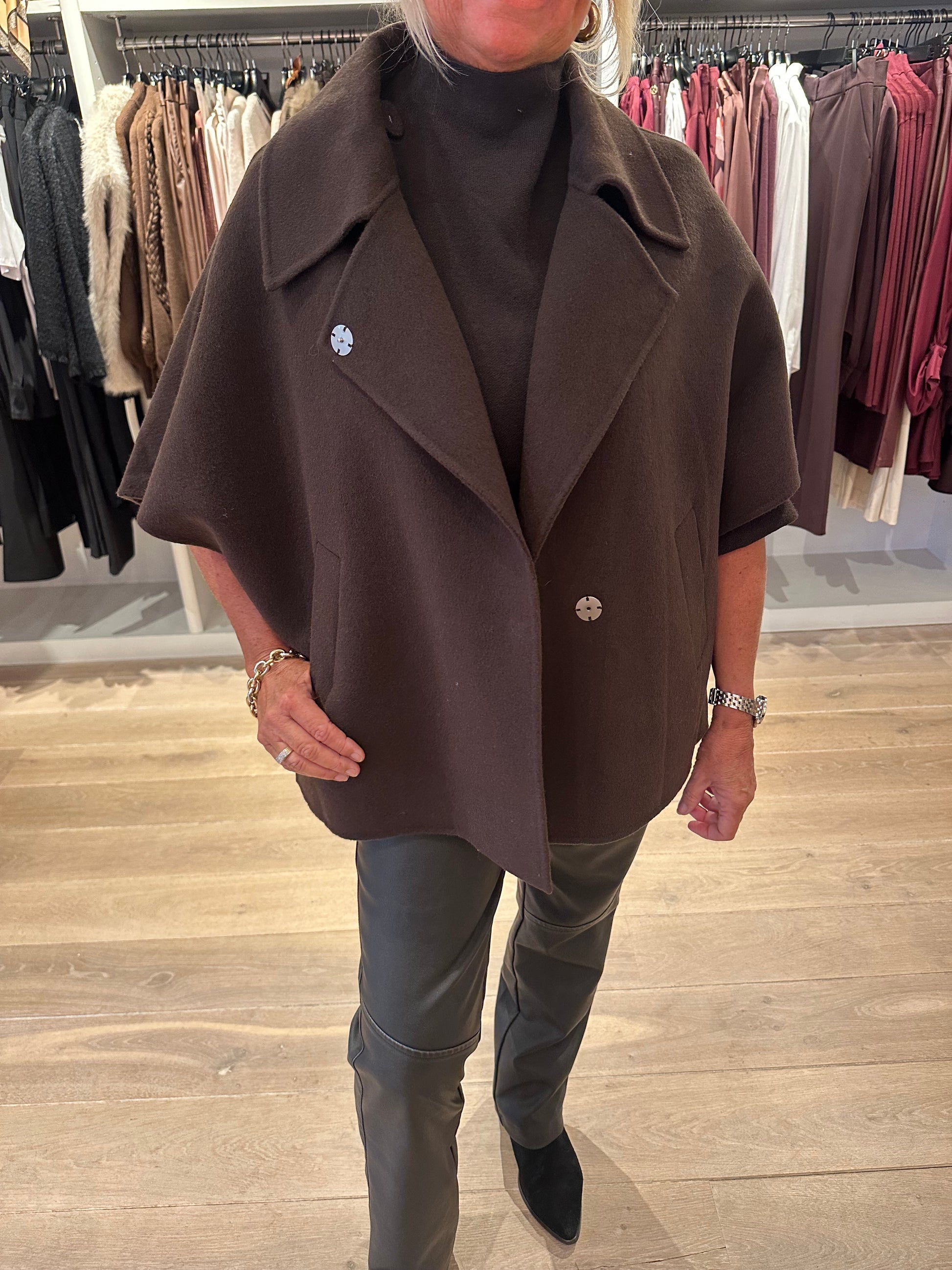 Super mooie cape van 70% wol. Donkerbruin, one size te dragen tm maat 44