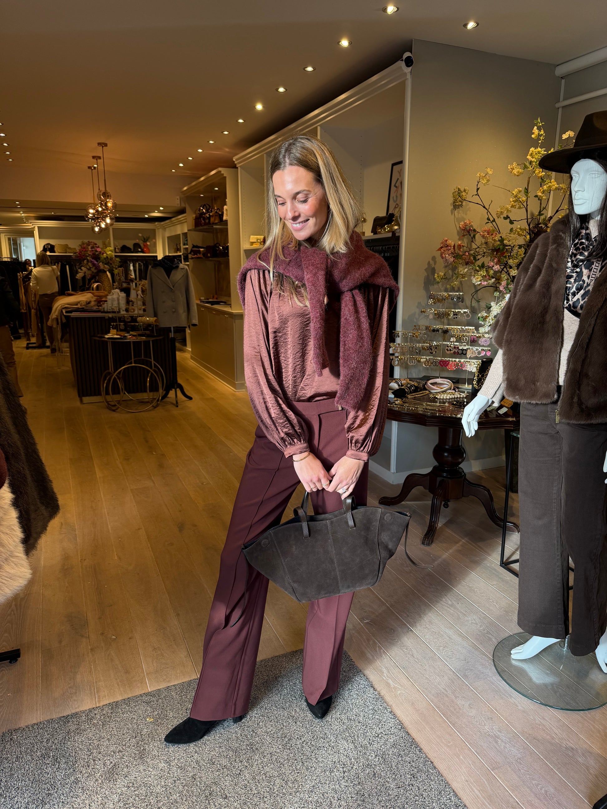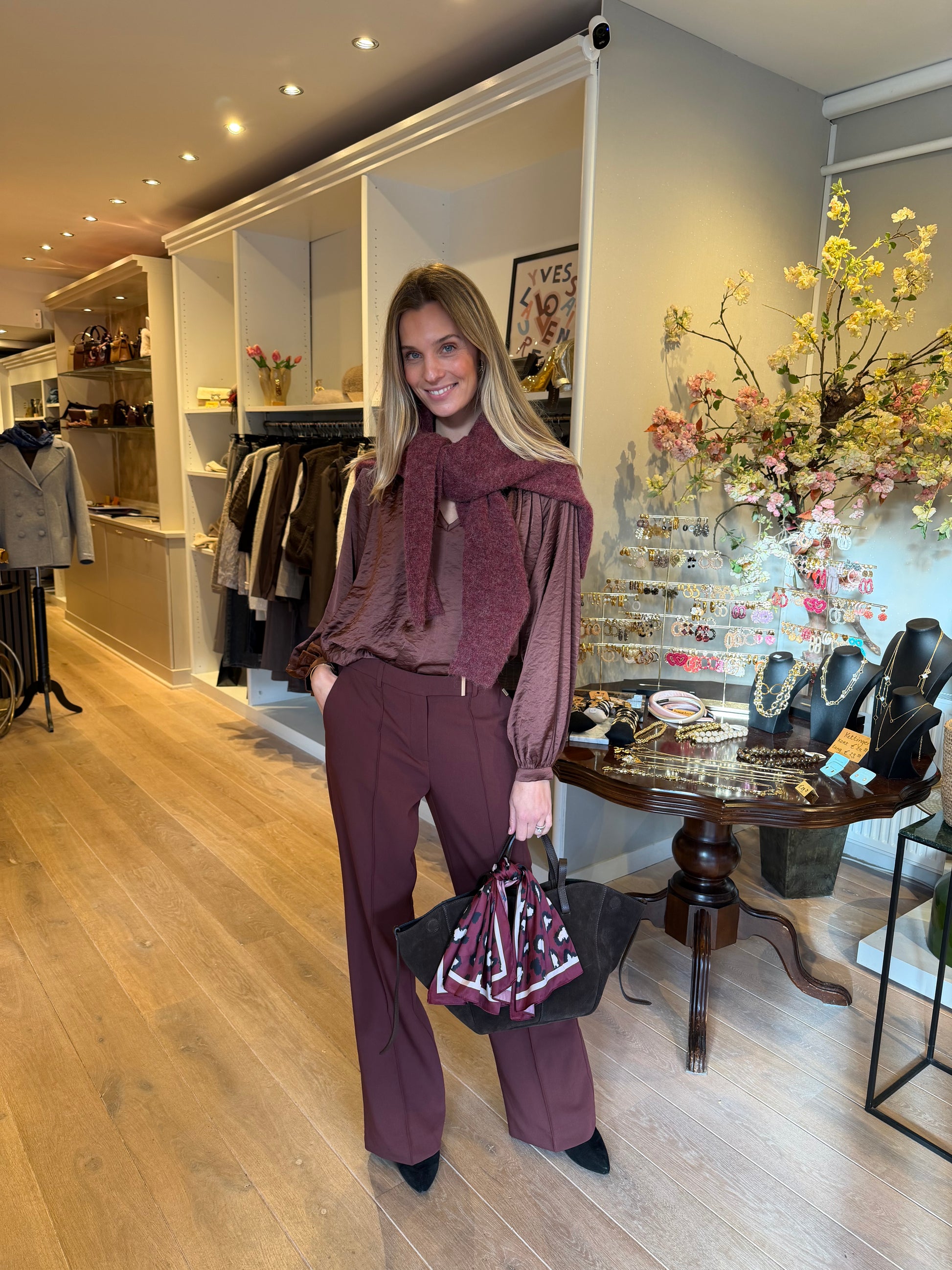 De Chantalle broek is uitgevoerd in een warme bordeaux-tint die meteen een rijke, stijlvolle uitstraling geeft. De rechte pijpen en strakke persvouw creëren een krachtig silhouet, terwijl het goudkleurige gespdetail op de tailleband zorgt voor een subtiel accent.