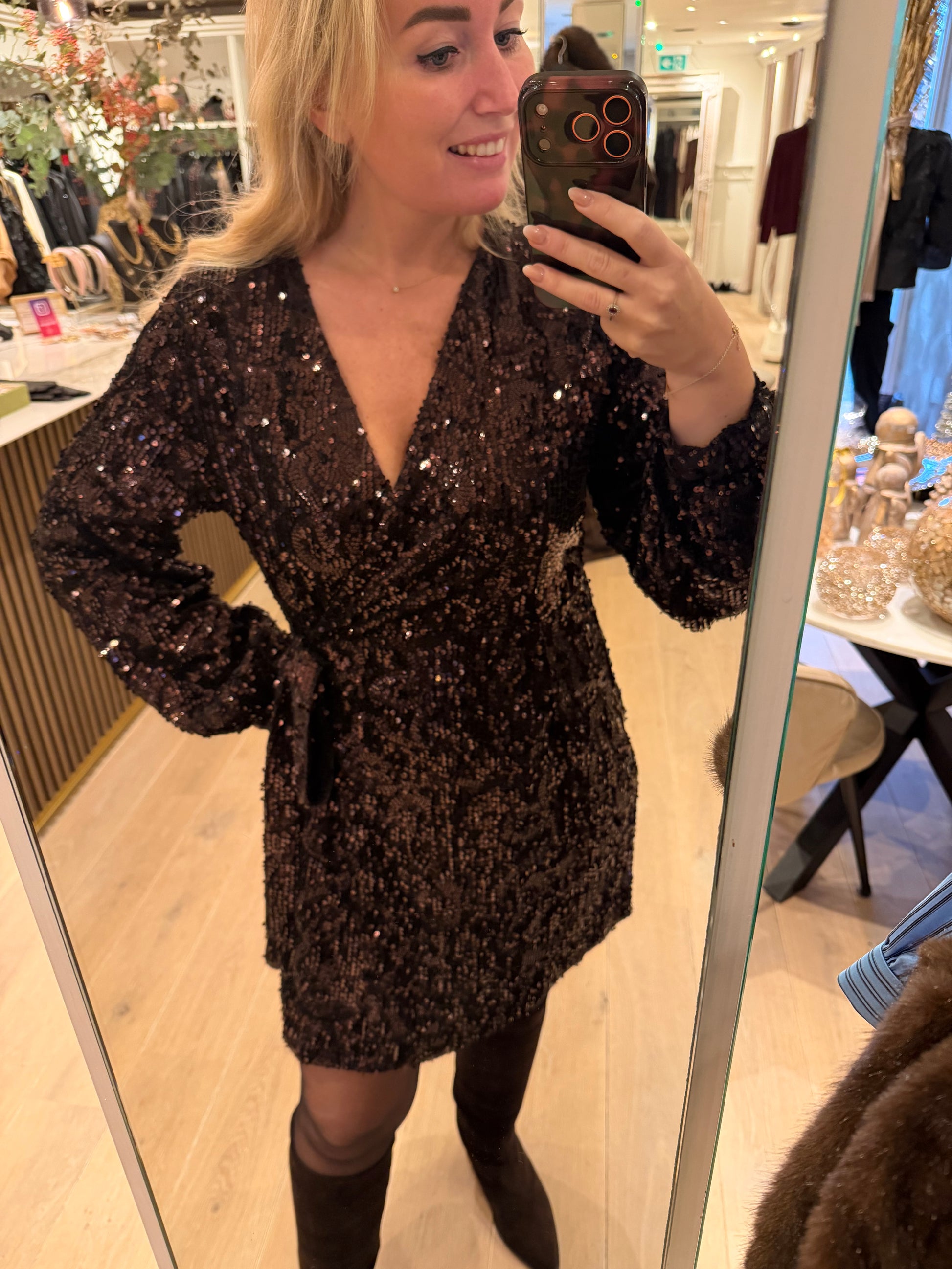 super leuke overslag jurk! Kan je zelf verstellen. Zwarte ondertoon en bruine pailletten.
