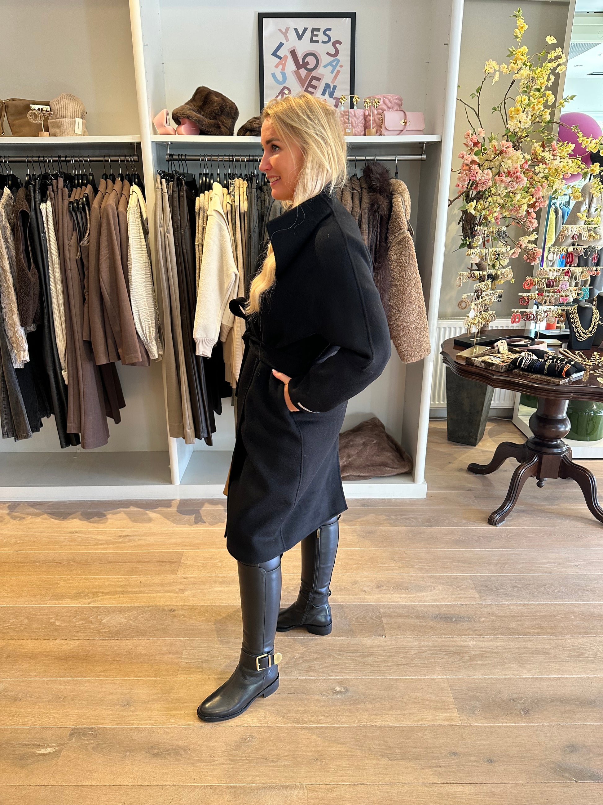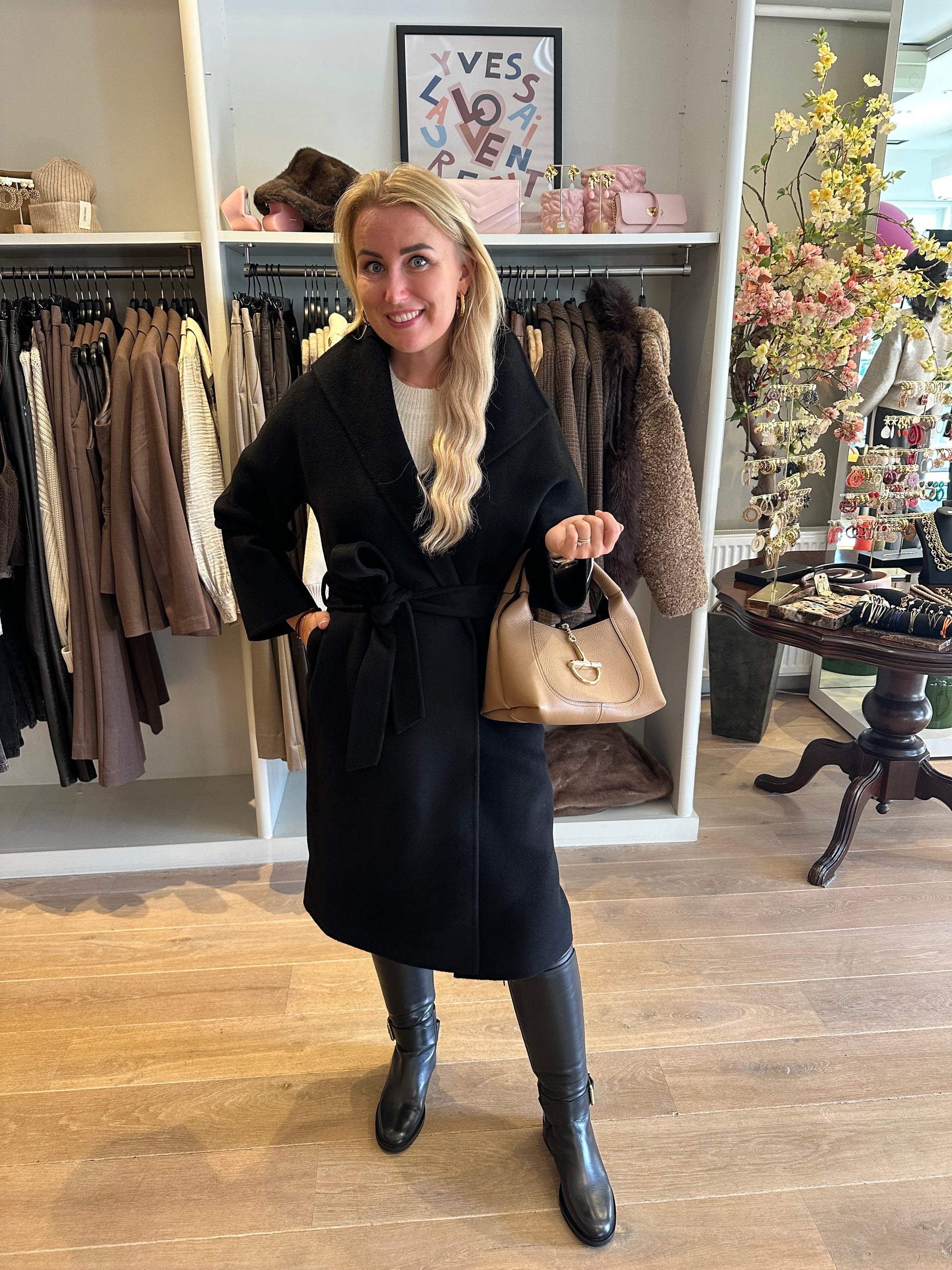 Exclusieve design en eigen label prachtige cashmere wol mantel in het zwart. Patty draagt de maat S/M en valt tm goede maat 40. De maat L/XL tm ruime 42.