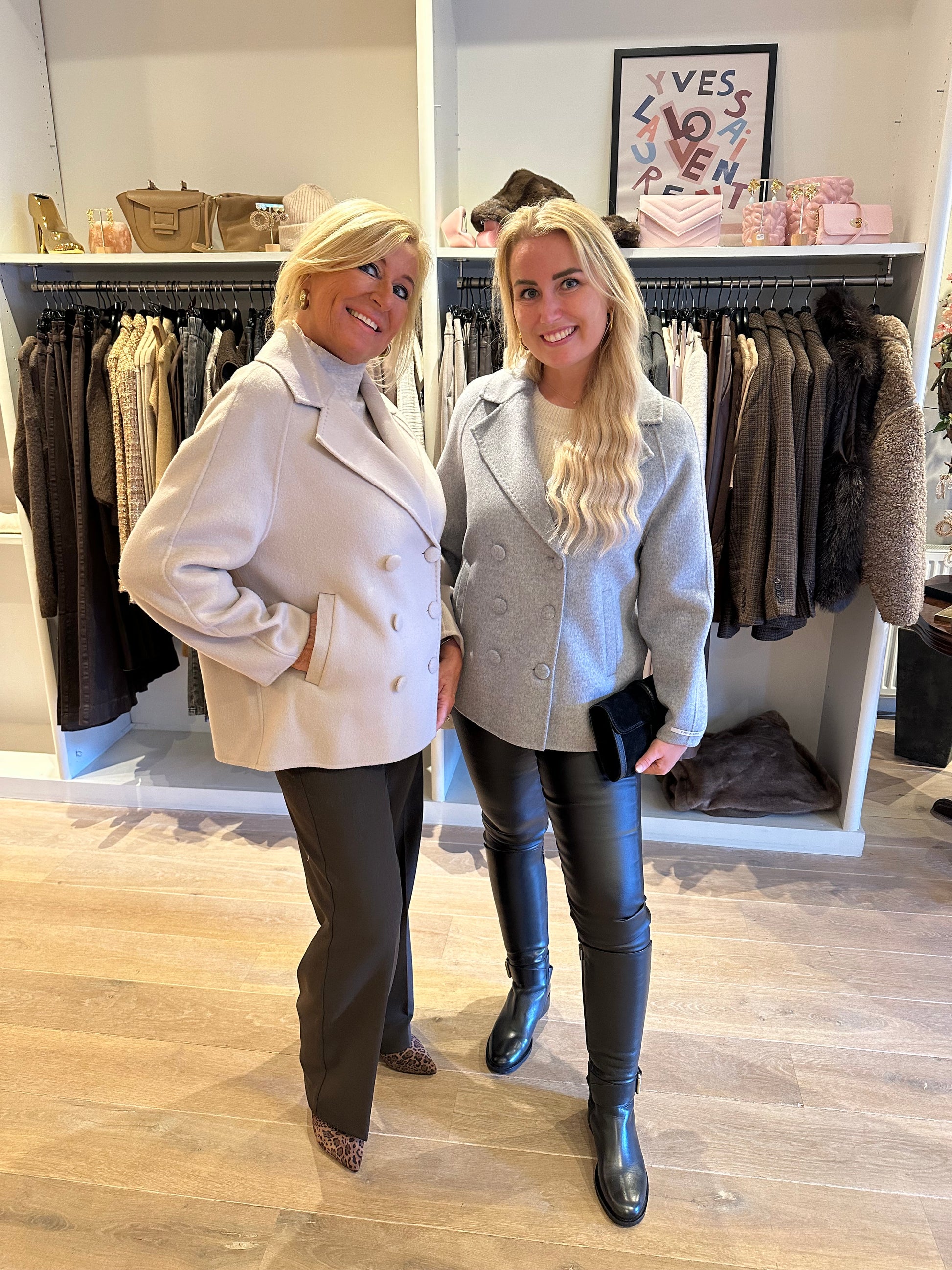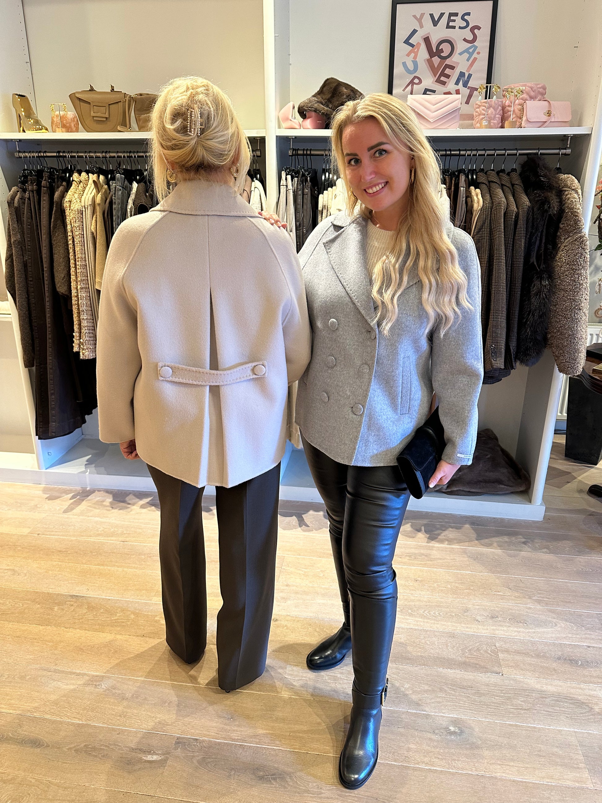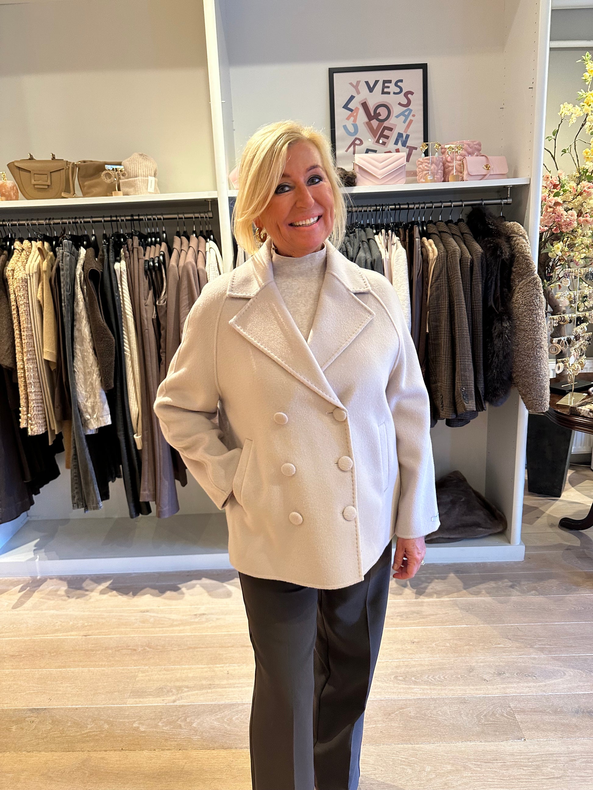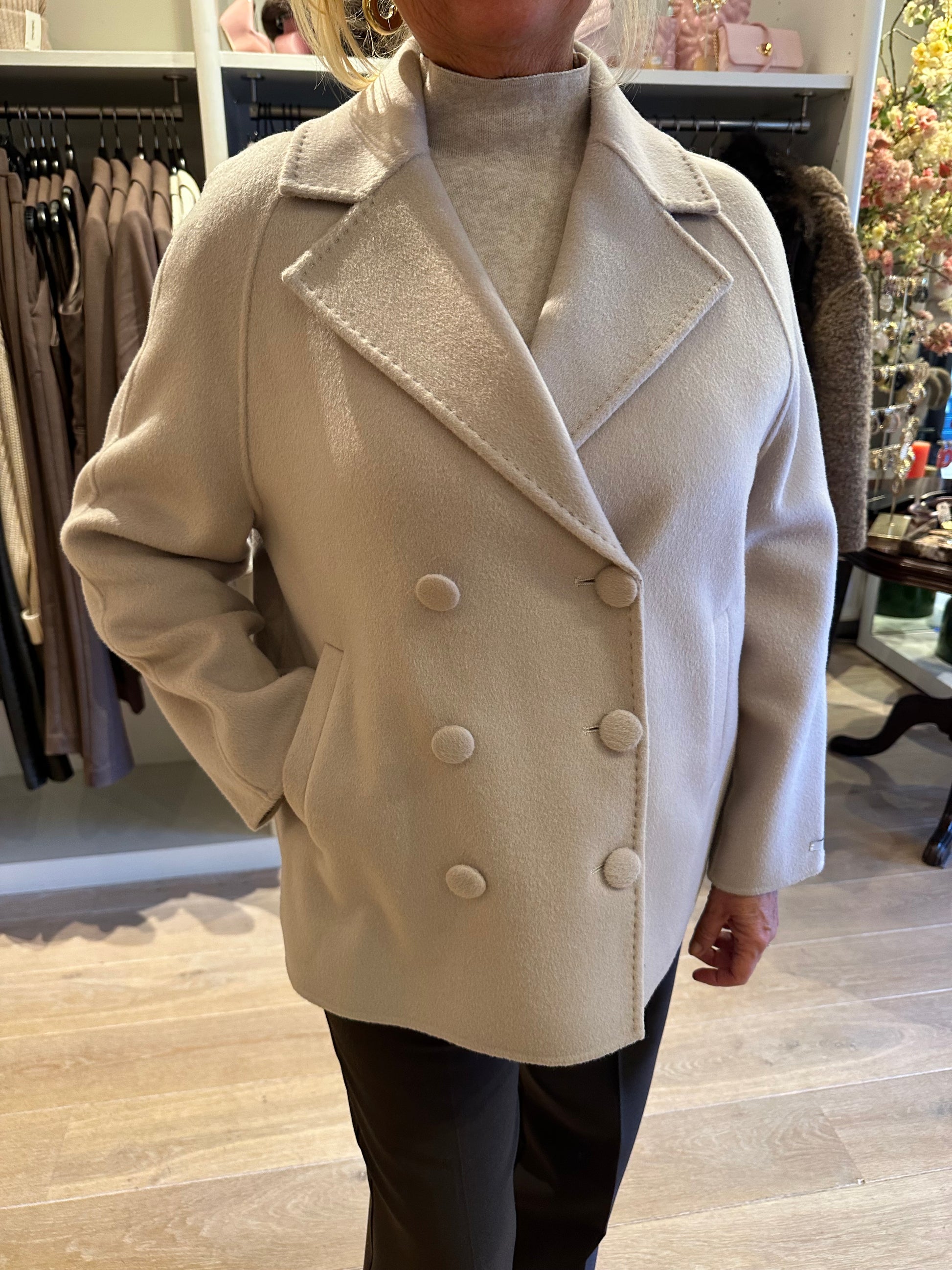 Exclusieve design en eigen label prachtige cashmere wol korte mantel in krijt beige kleur. Uniek design met mooie gestoffeerde knopen en een leuk plooi detail op de rug. De jassen vallen goed op maat.