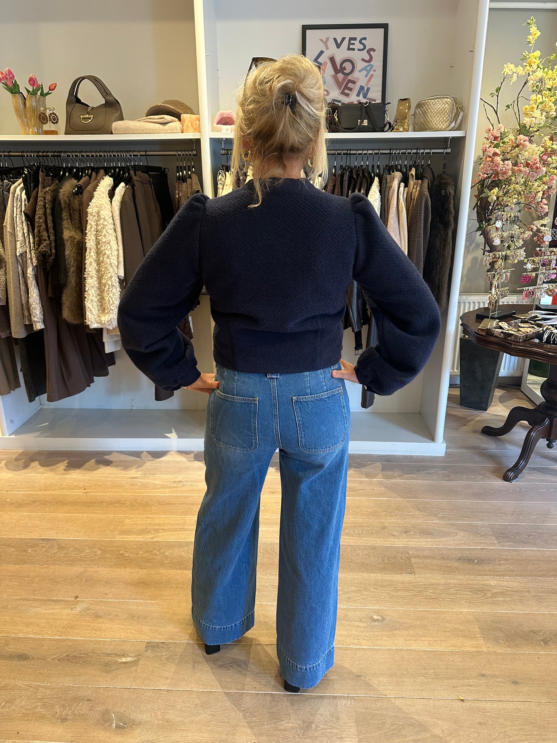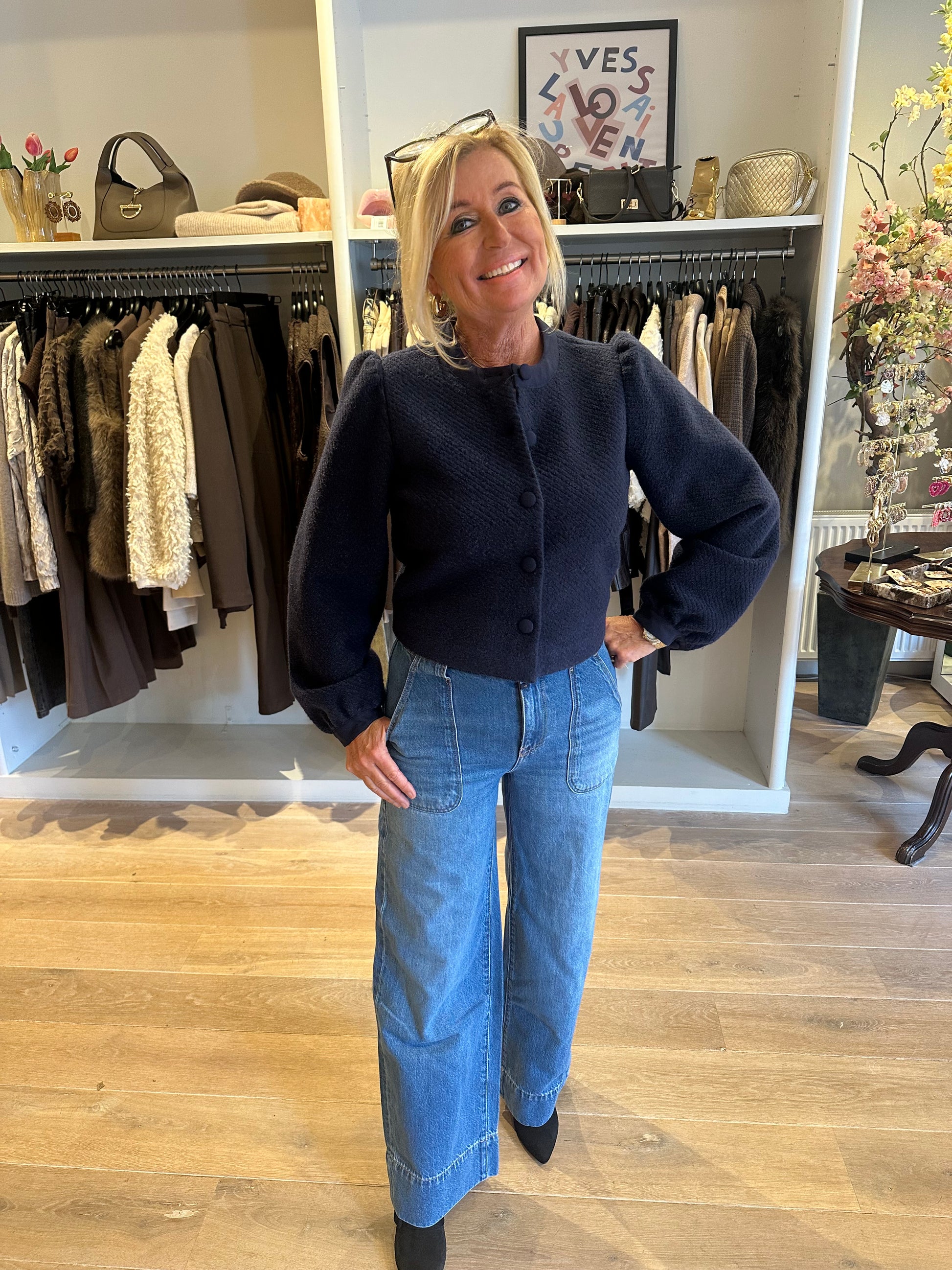 Super leuk kort blauw jasje van MSCH copenhagen. Leuke pofmouw en mooie gestoffeerde knopen. Maten vallen iets kleiner.