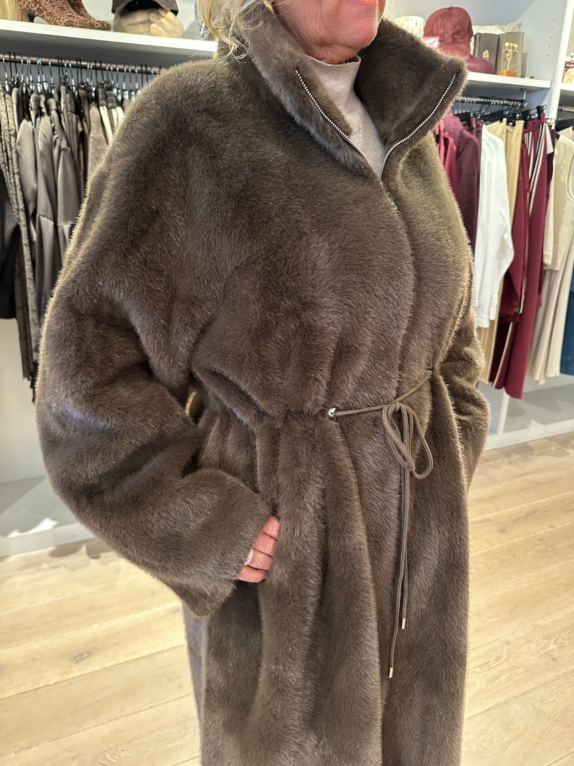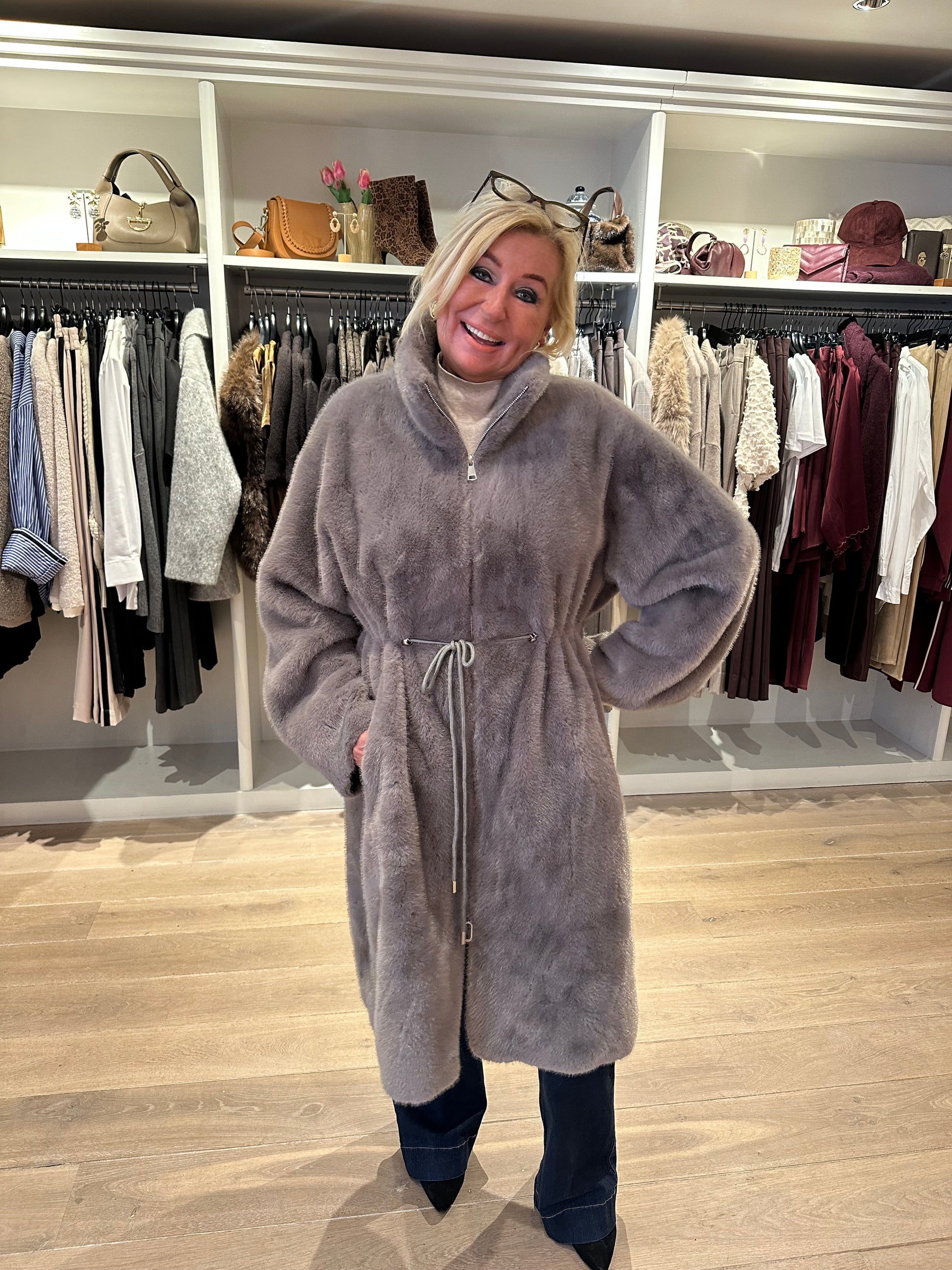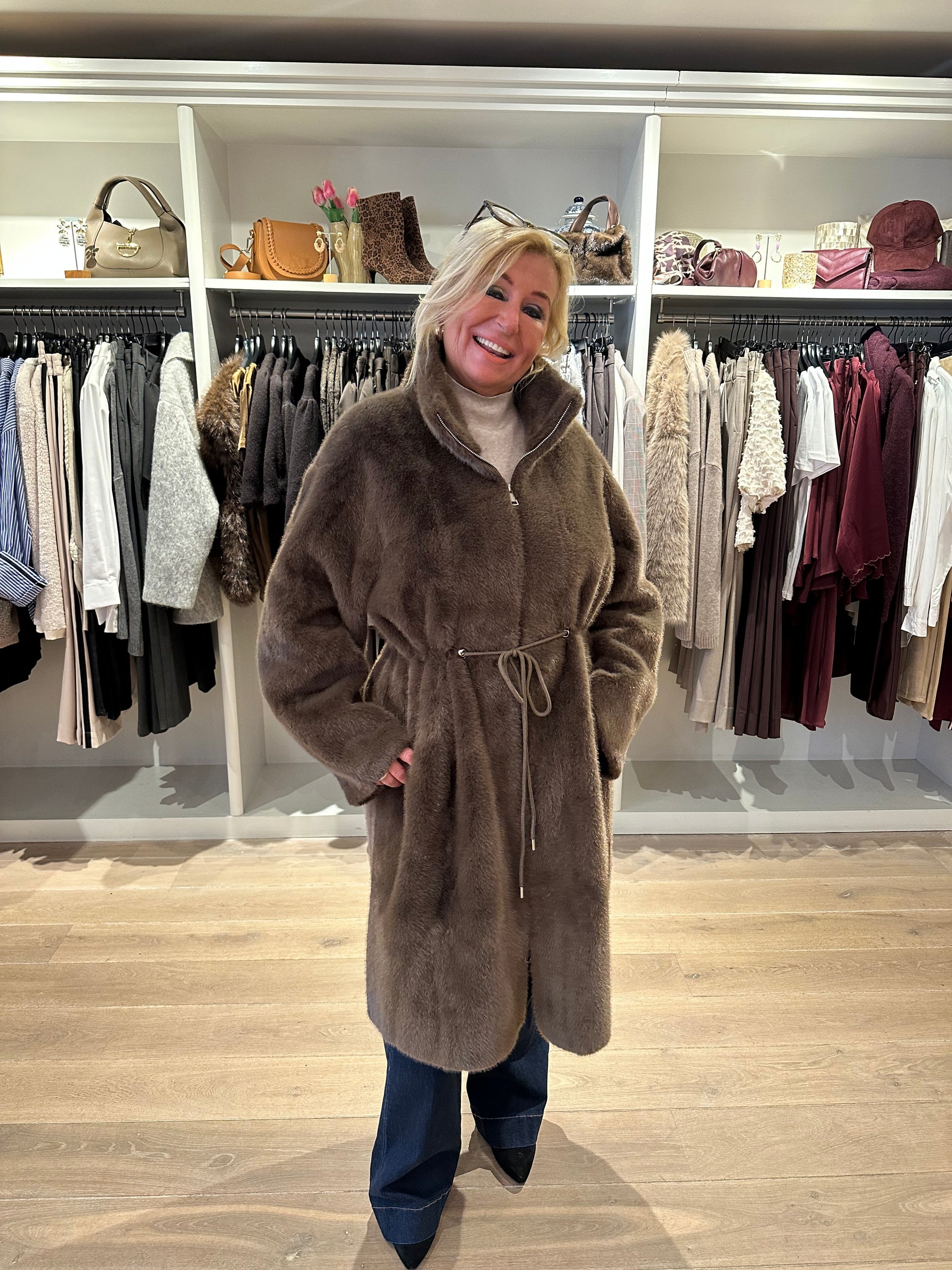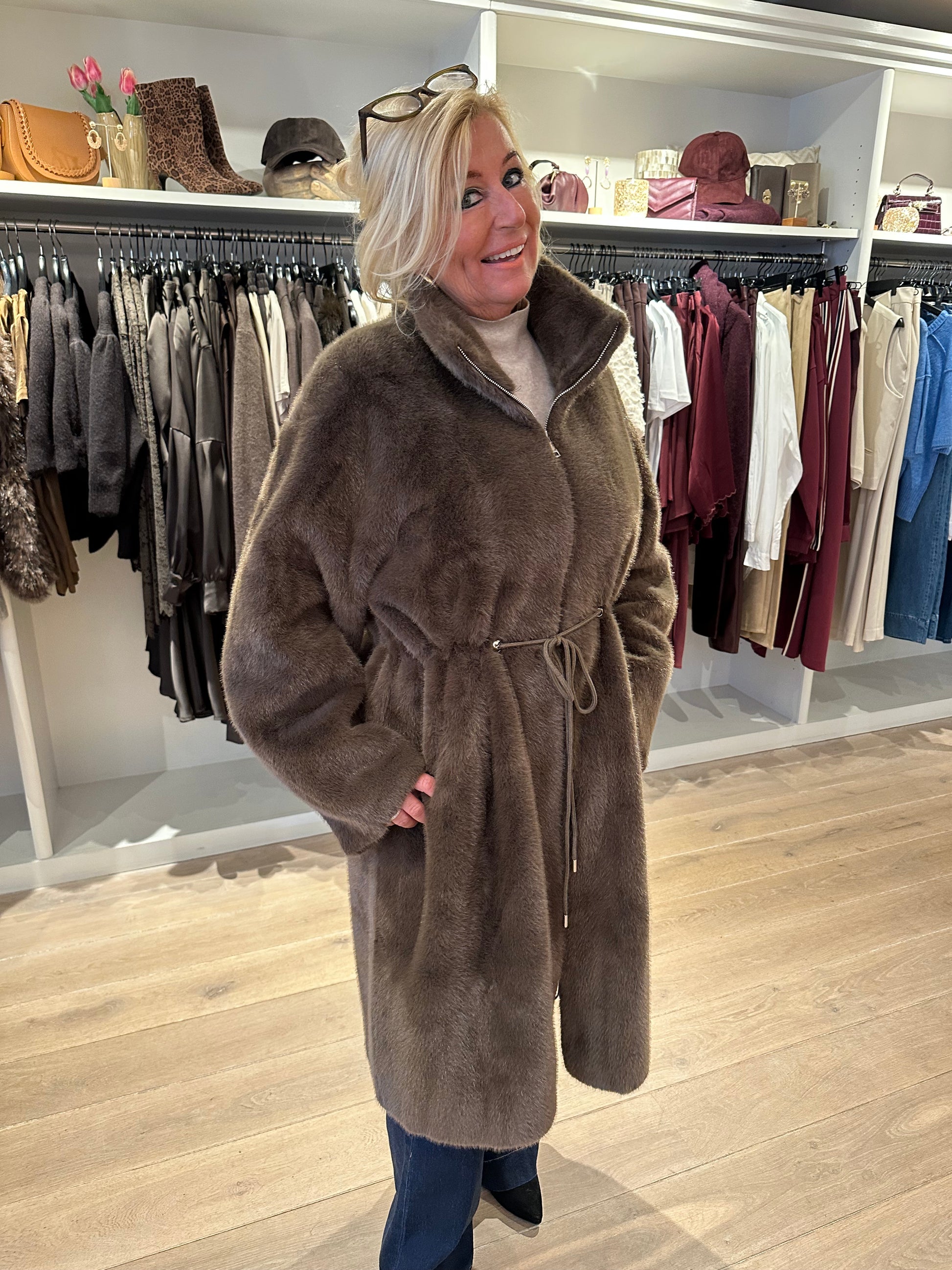 Gave fur jas met touwtjes om te tailleren. Hoeft niet, kan wel! One size te dragen tm maat 44.
