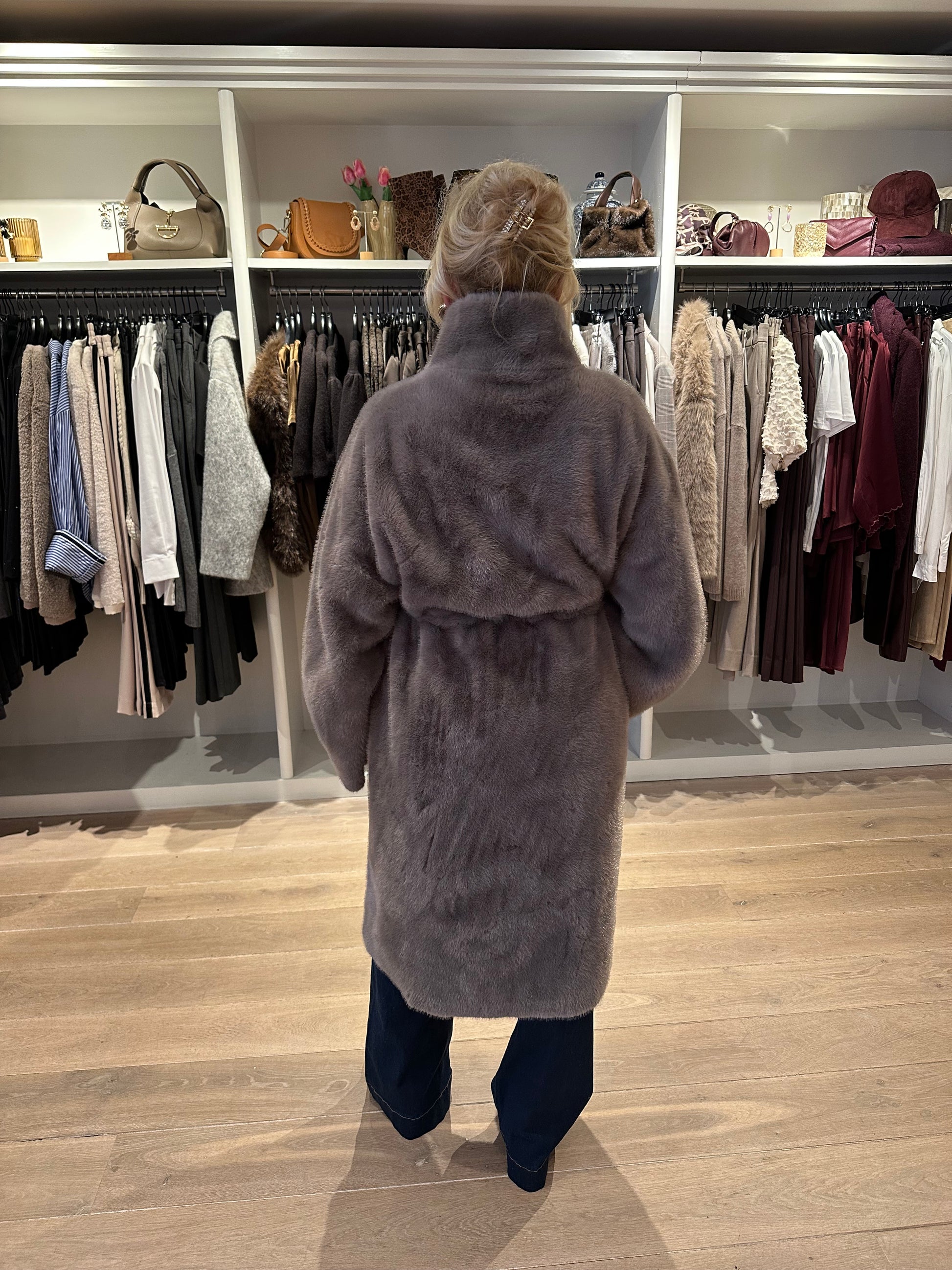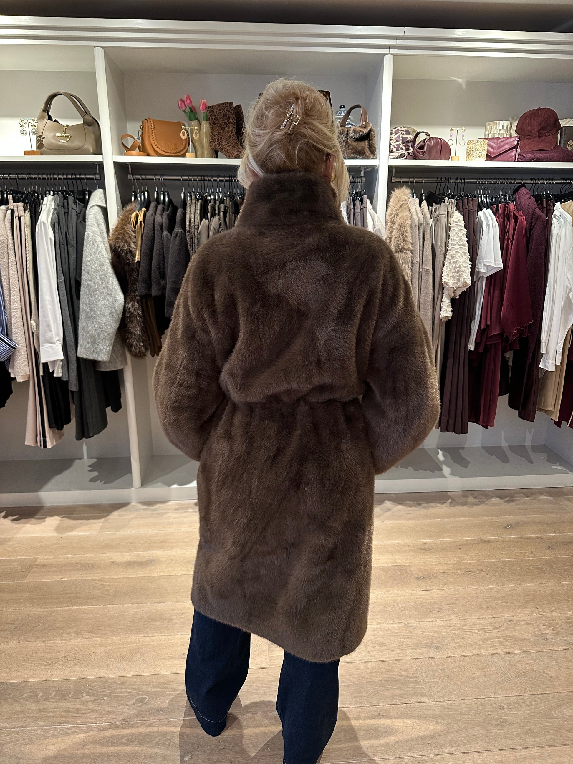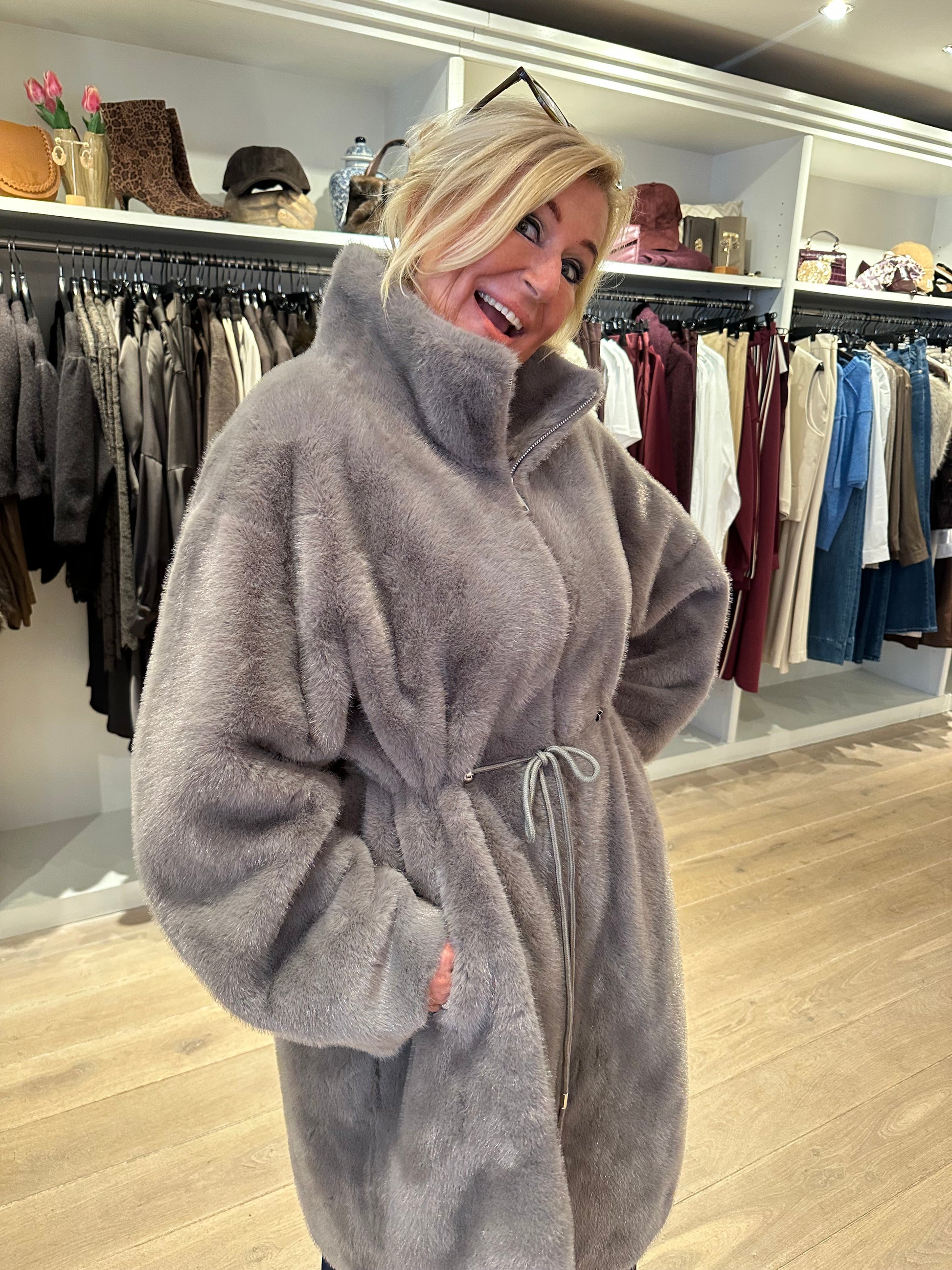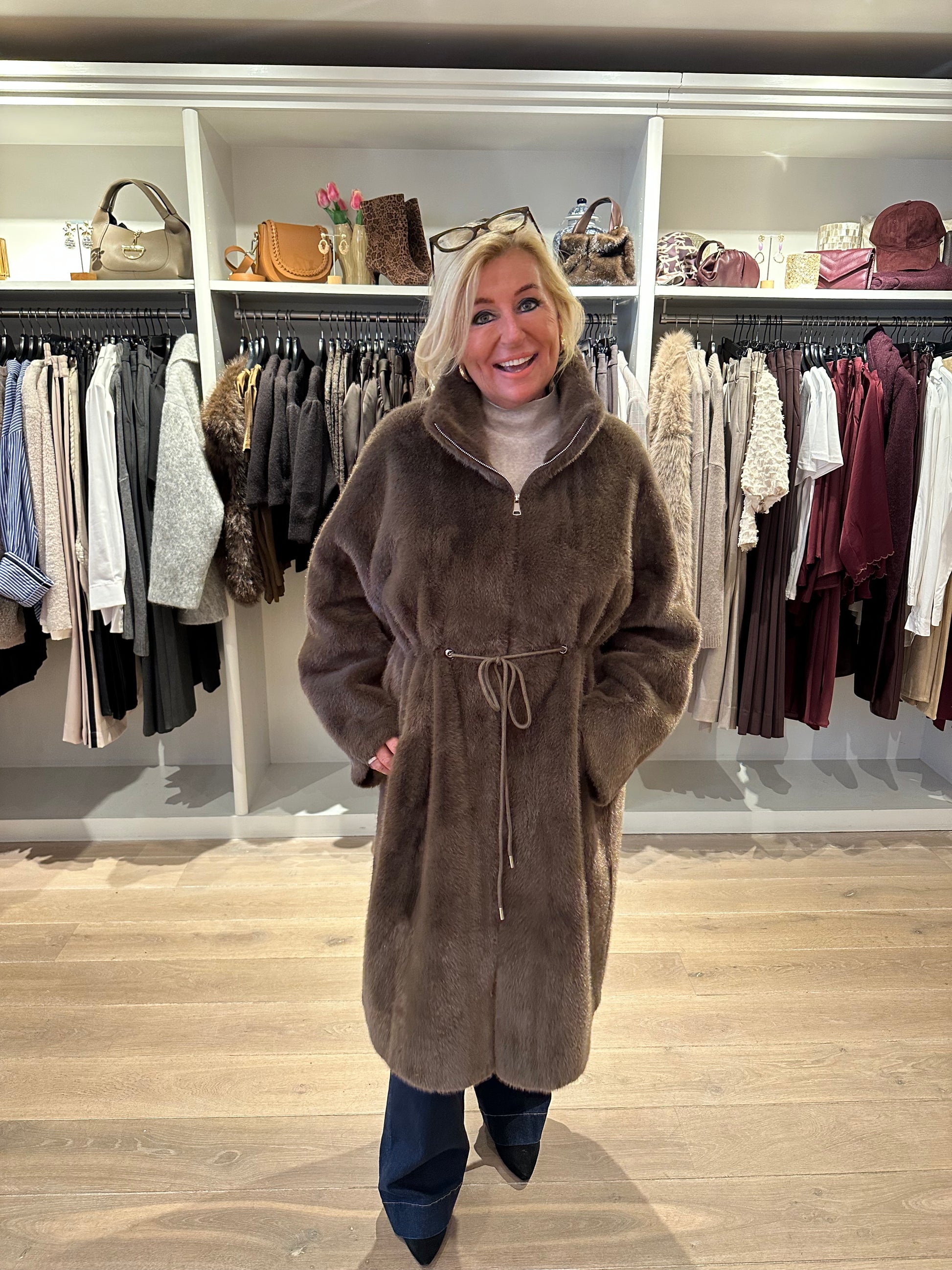 Gave fur jas met touwtjes om te tailleren. Hoeft niet, kan wel! One size te dragen tm maat 44.