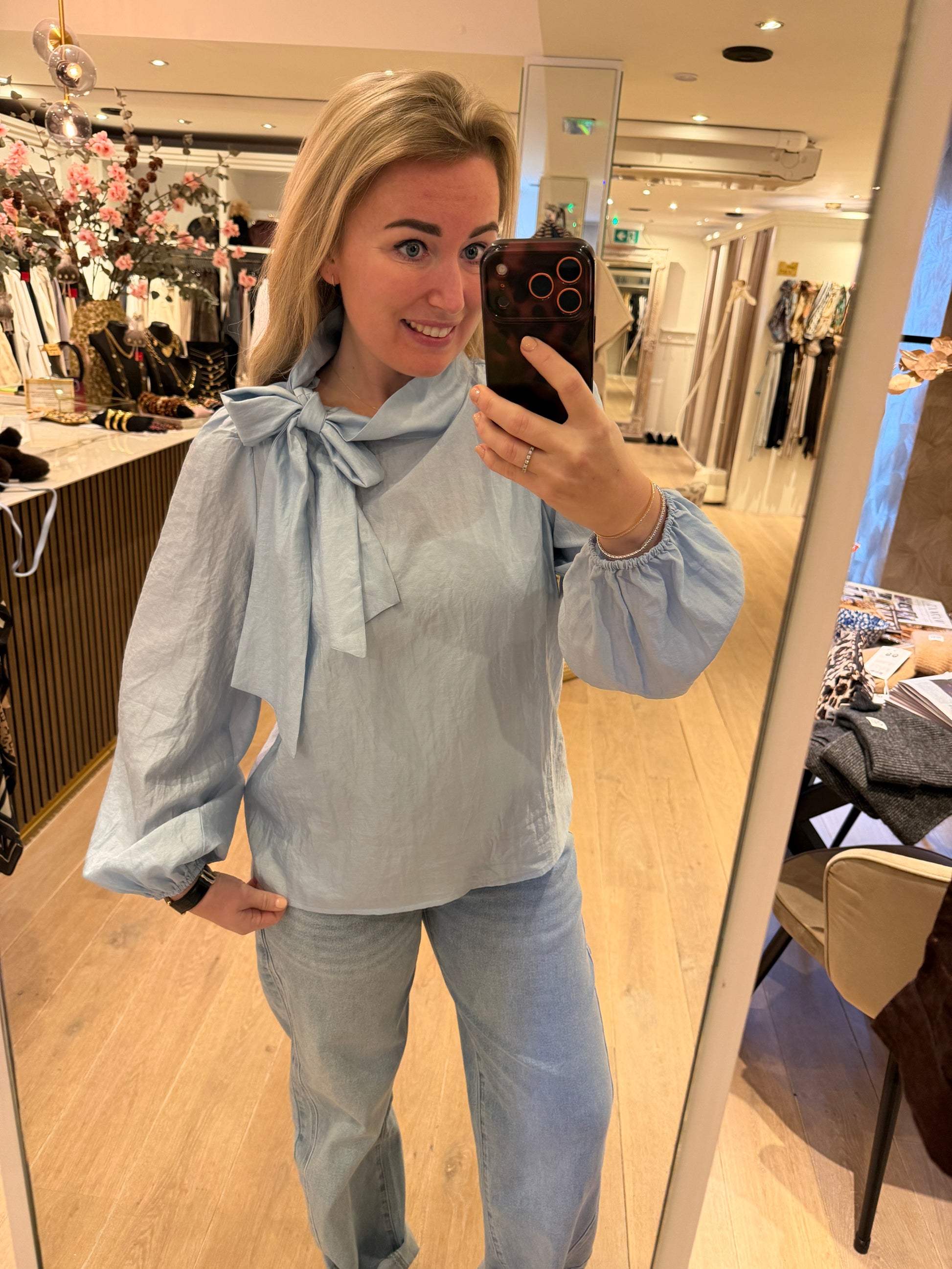 Super mooie blauwe blouse van neo noir met leuke strik en knoopjes op de schouder. Patty draagt maat 38.