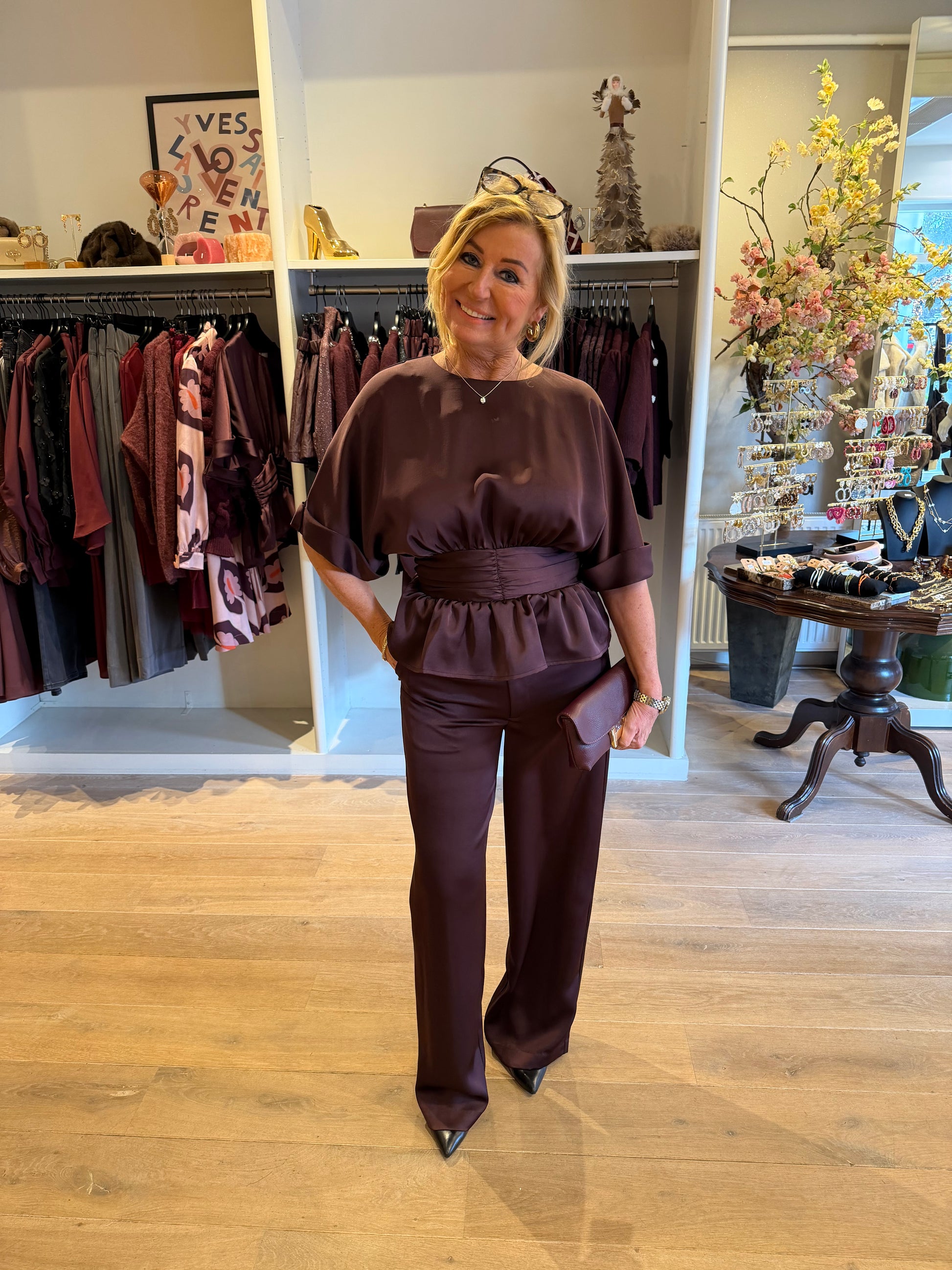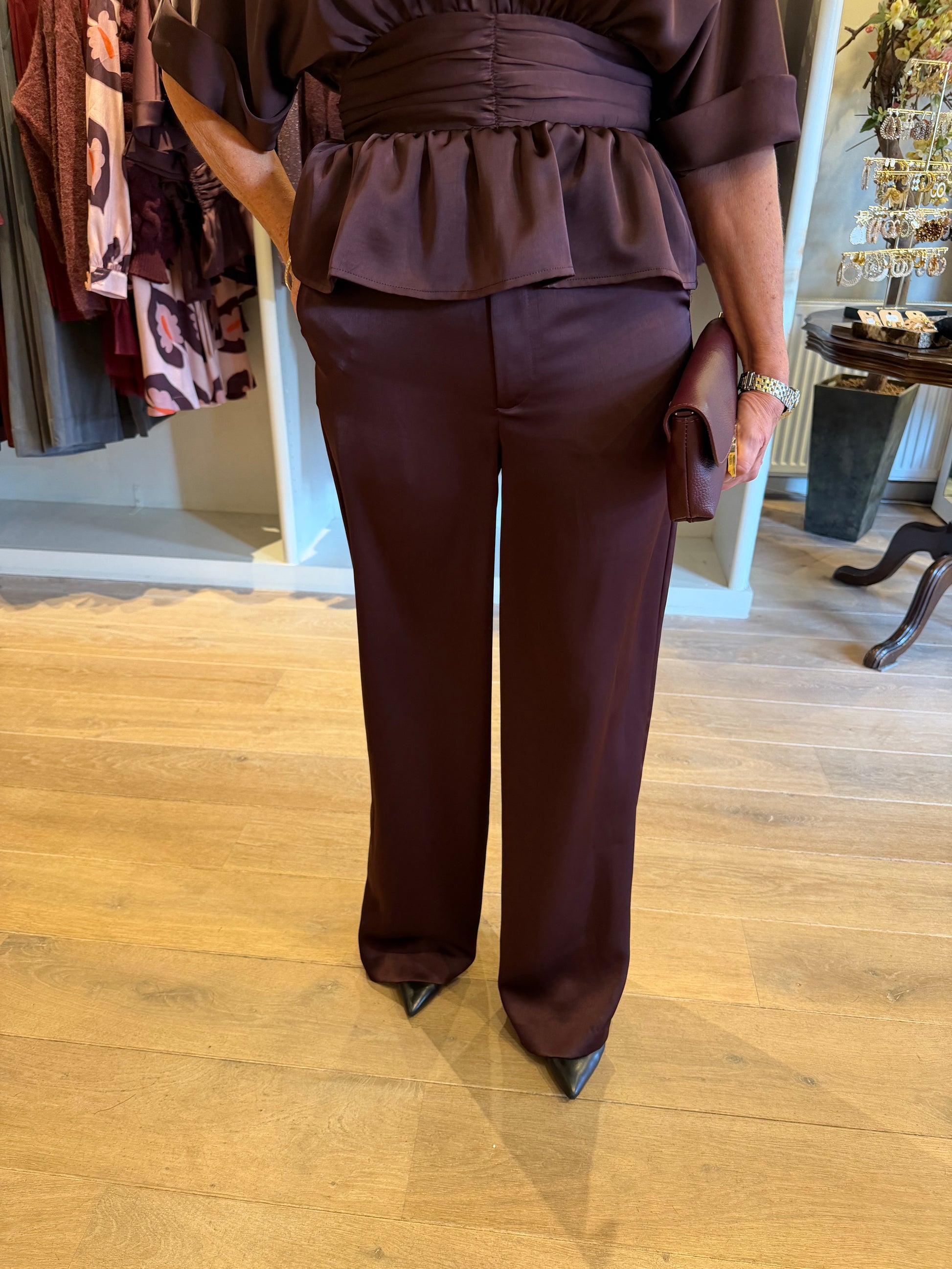 Super mooie satijnen soepel vallende pantalon in bordeaux kleur. Met elastieke band aan de achterzijde.