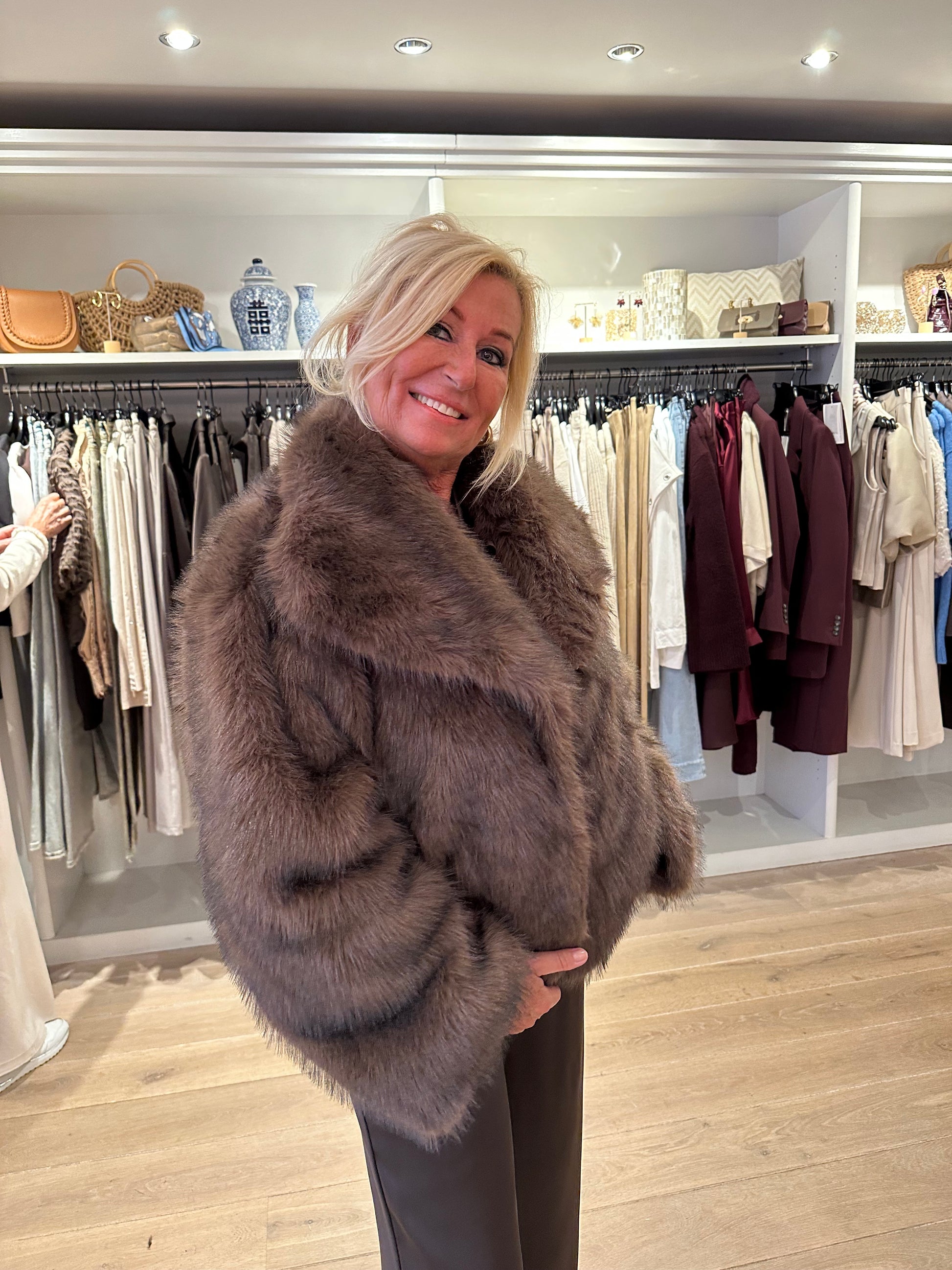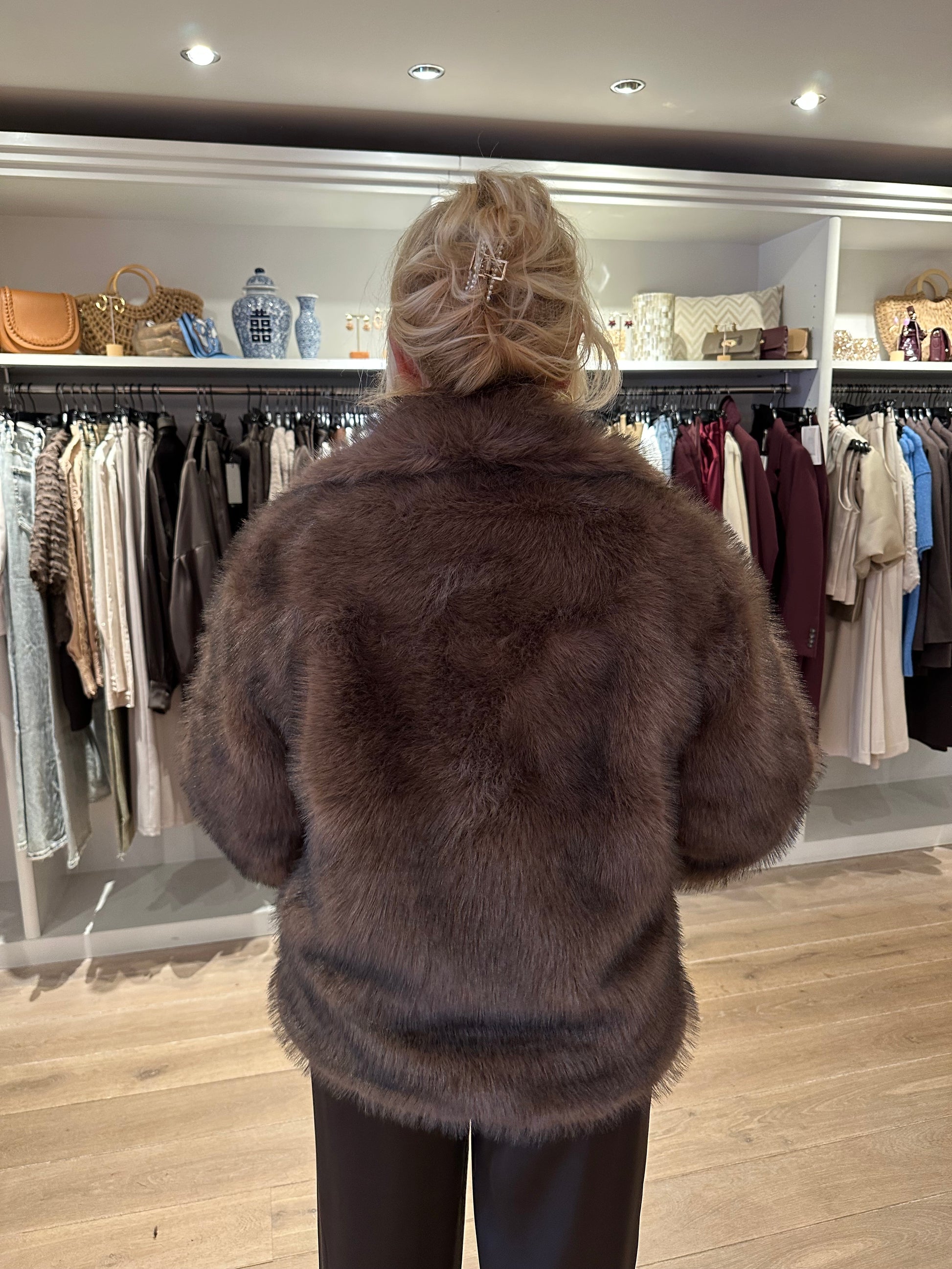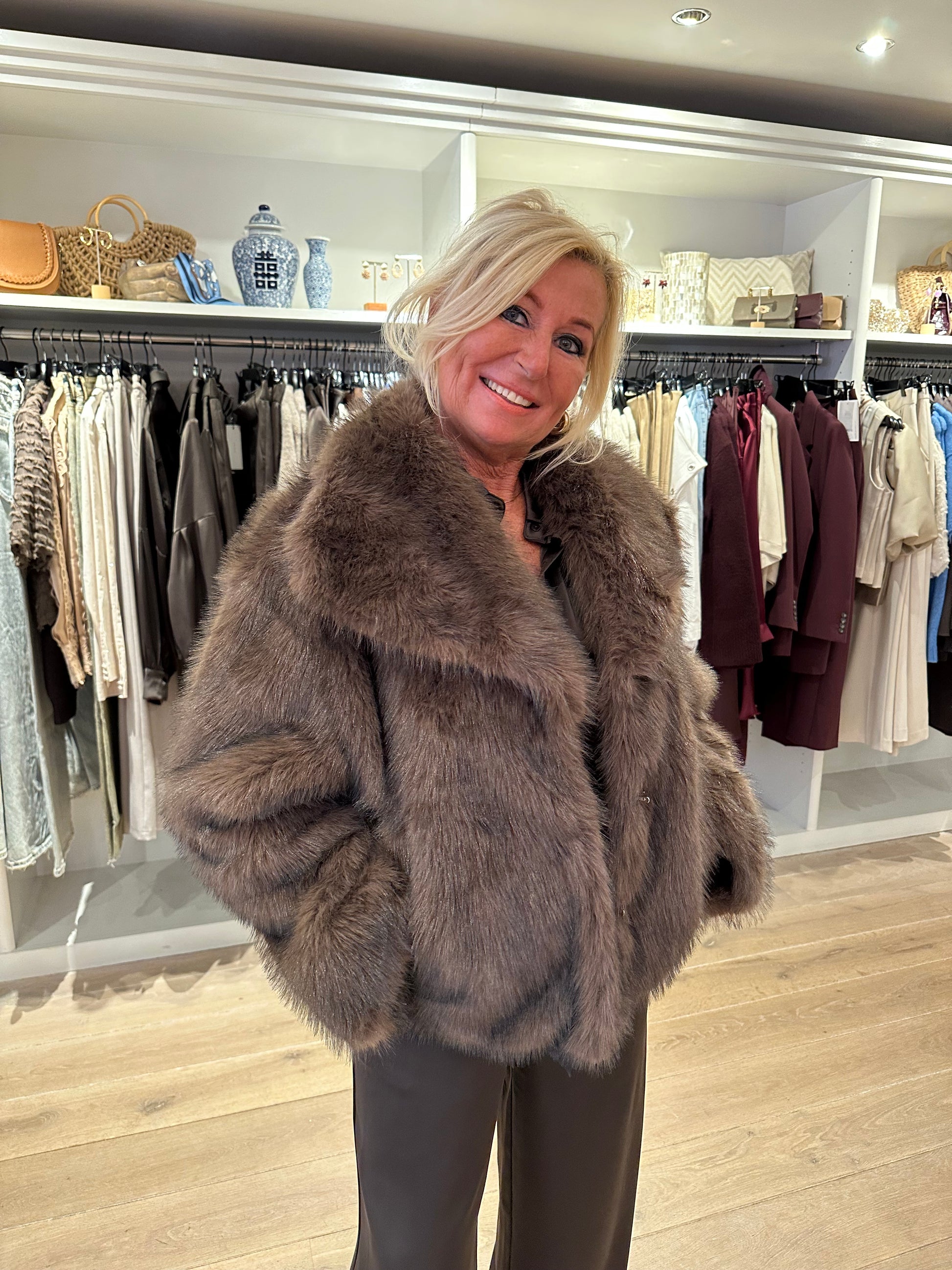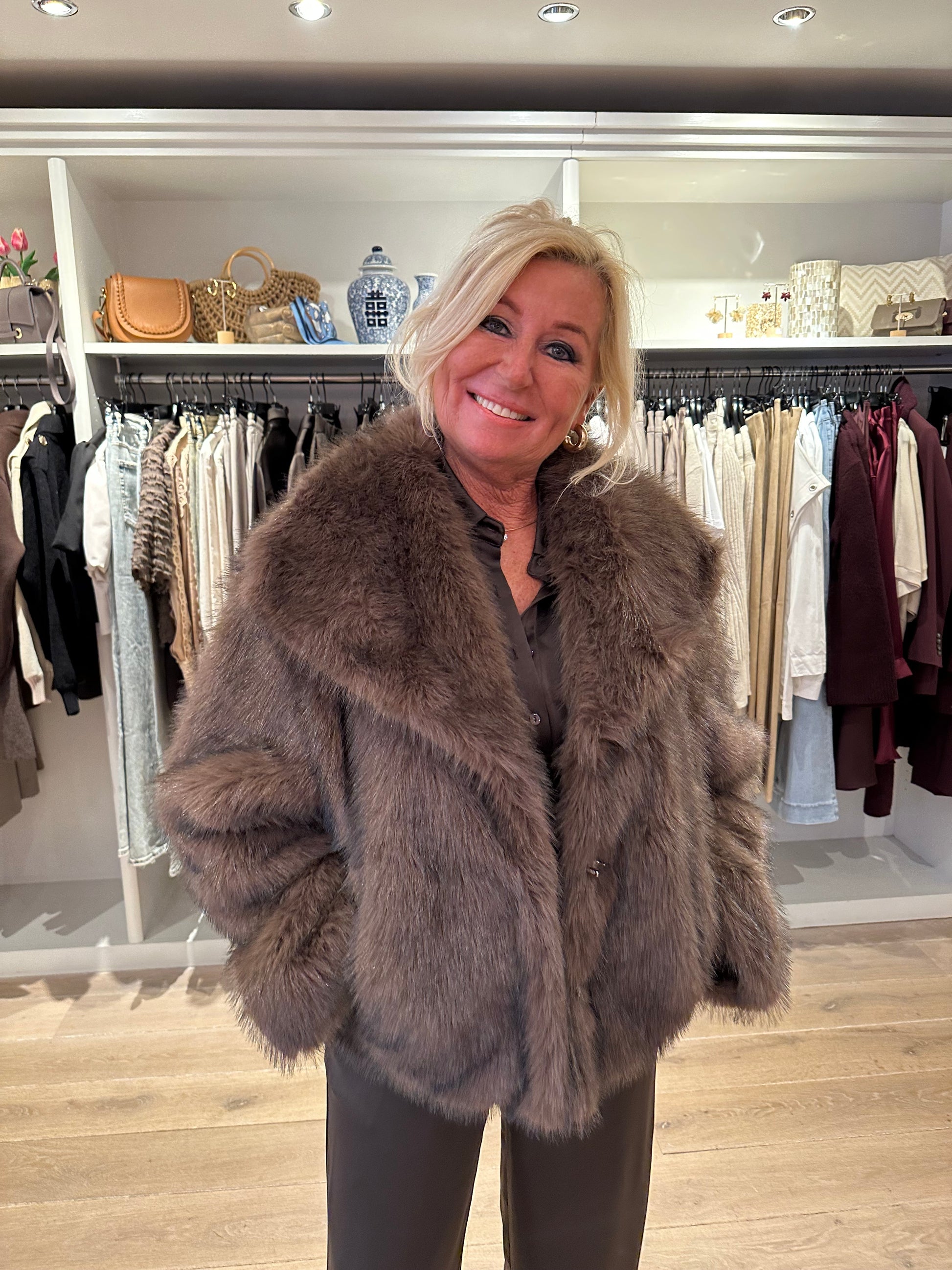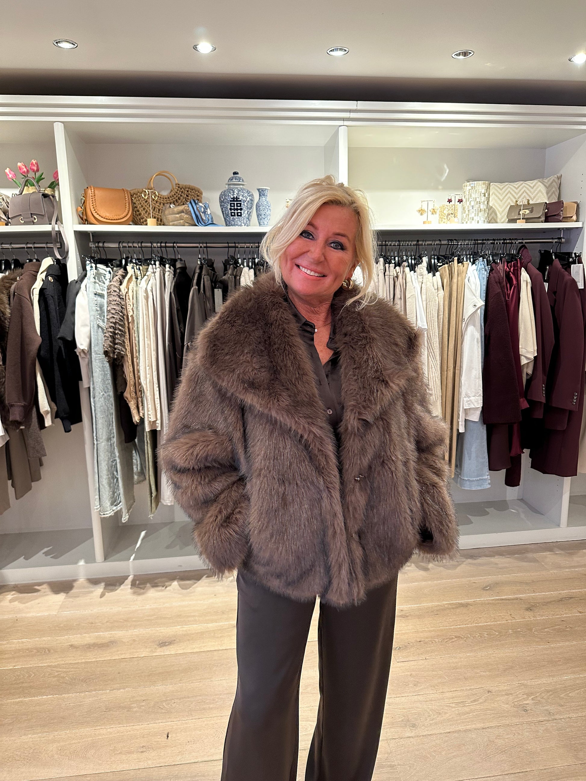 Wat een eye catcher! Super gave faux fur jas van neo noir met brede kraag! Donkerbruin maar met zwart gemêleerd. Valt oversized dus neem een maatje kleiner. Margaret draagt 36.
