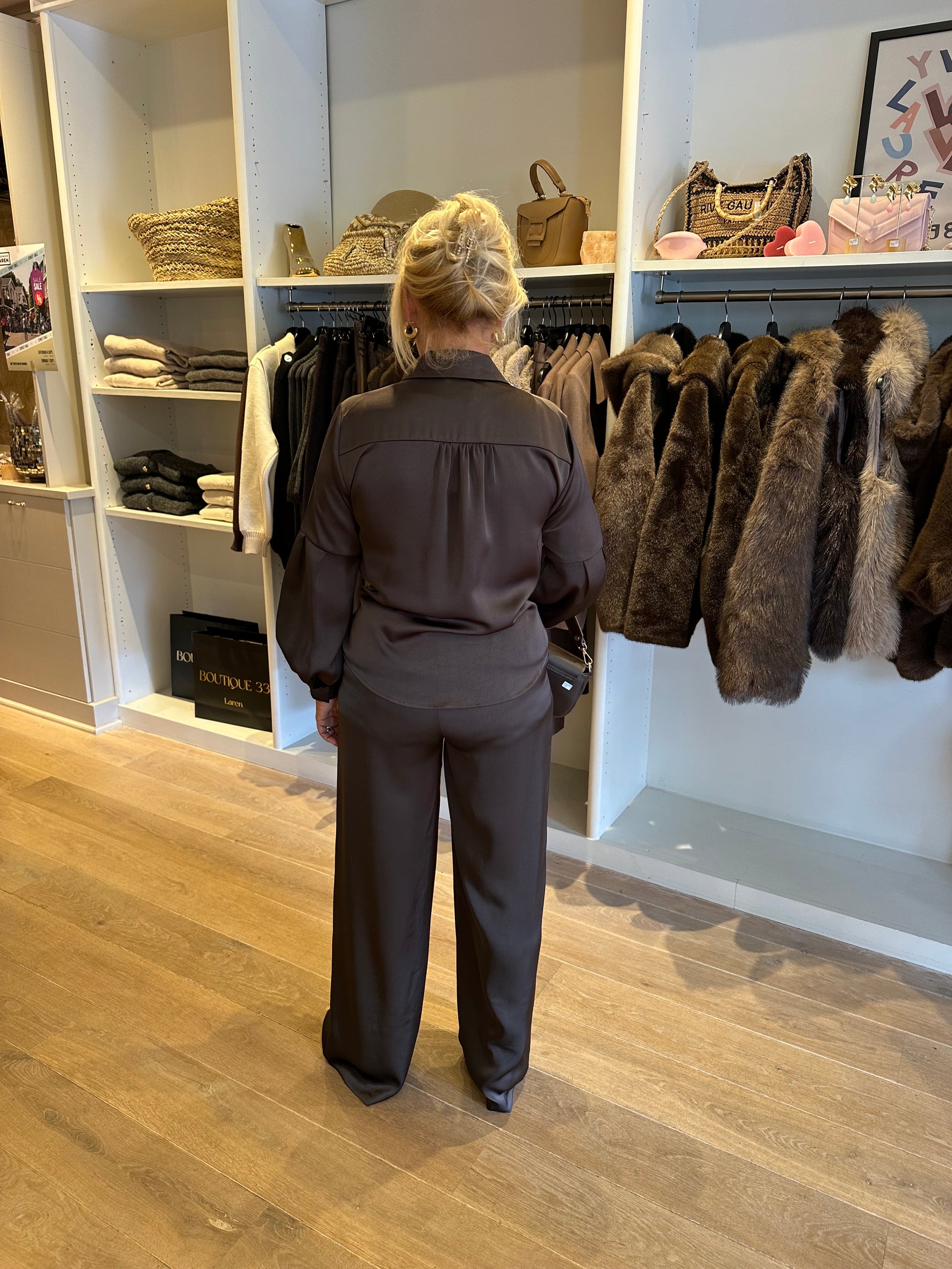 Mooie satijnen pantalon met elastiek aan de achterkant van Neo Noir in donkerbruin. Mooi te combineren met de bijpassende blouse. Maten vallen normaal.
