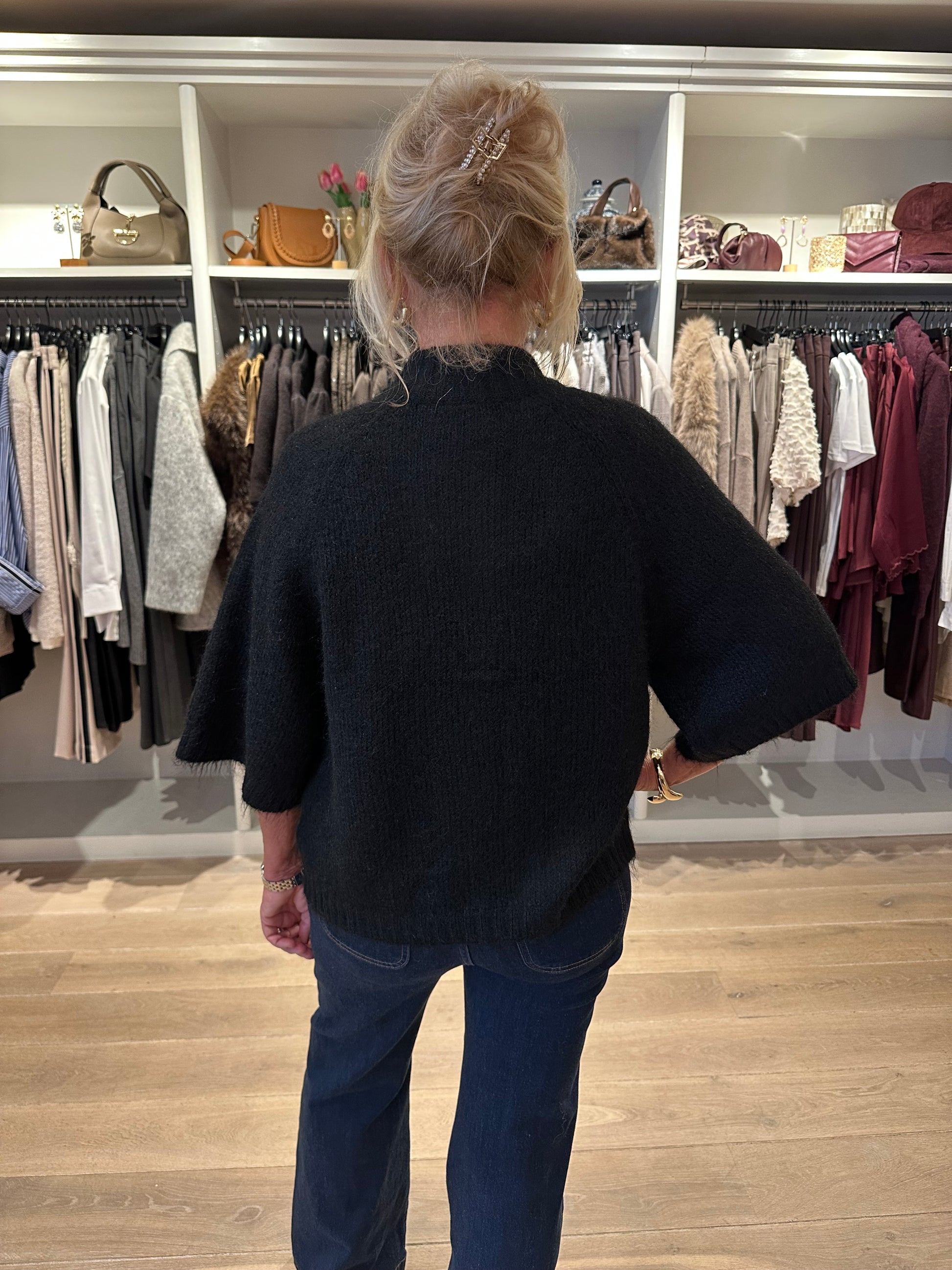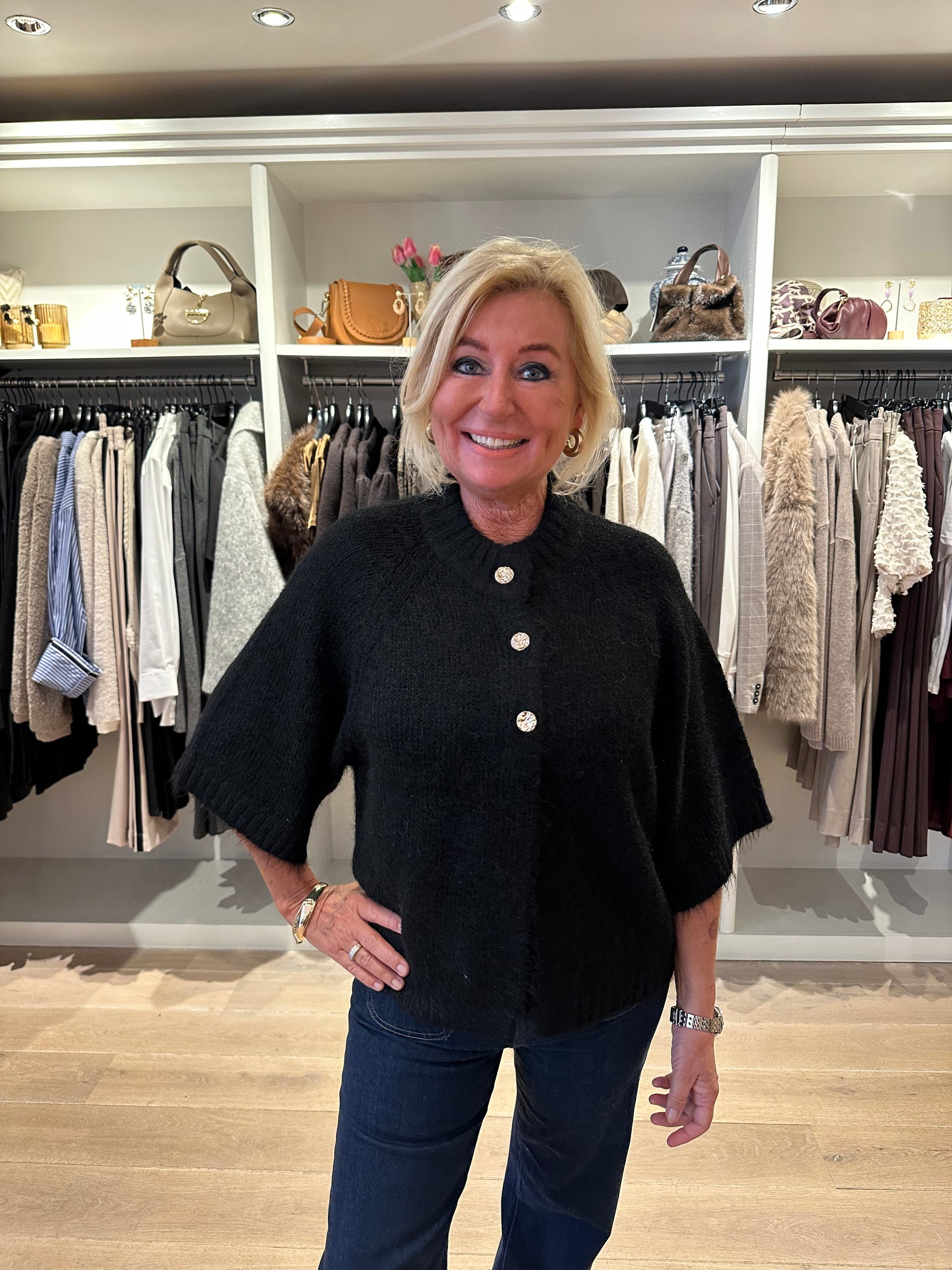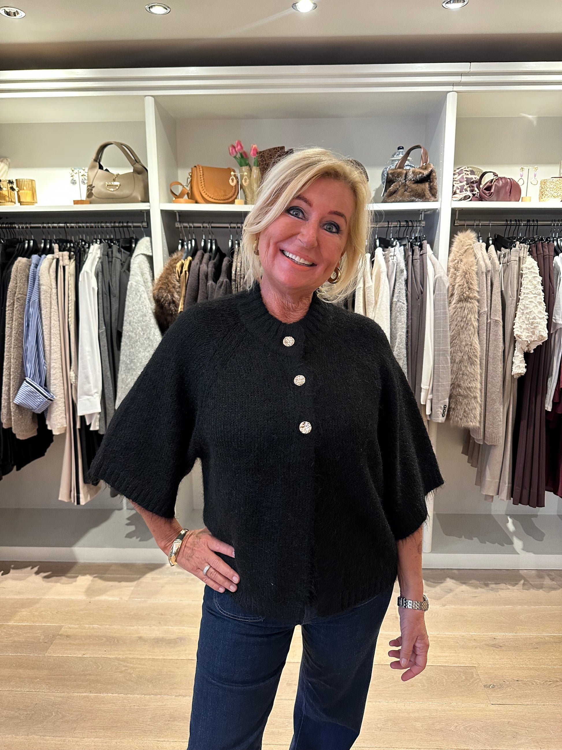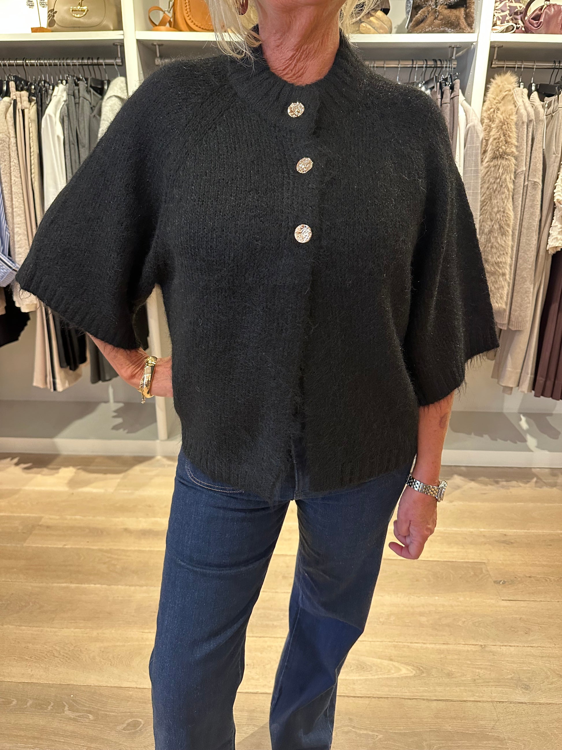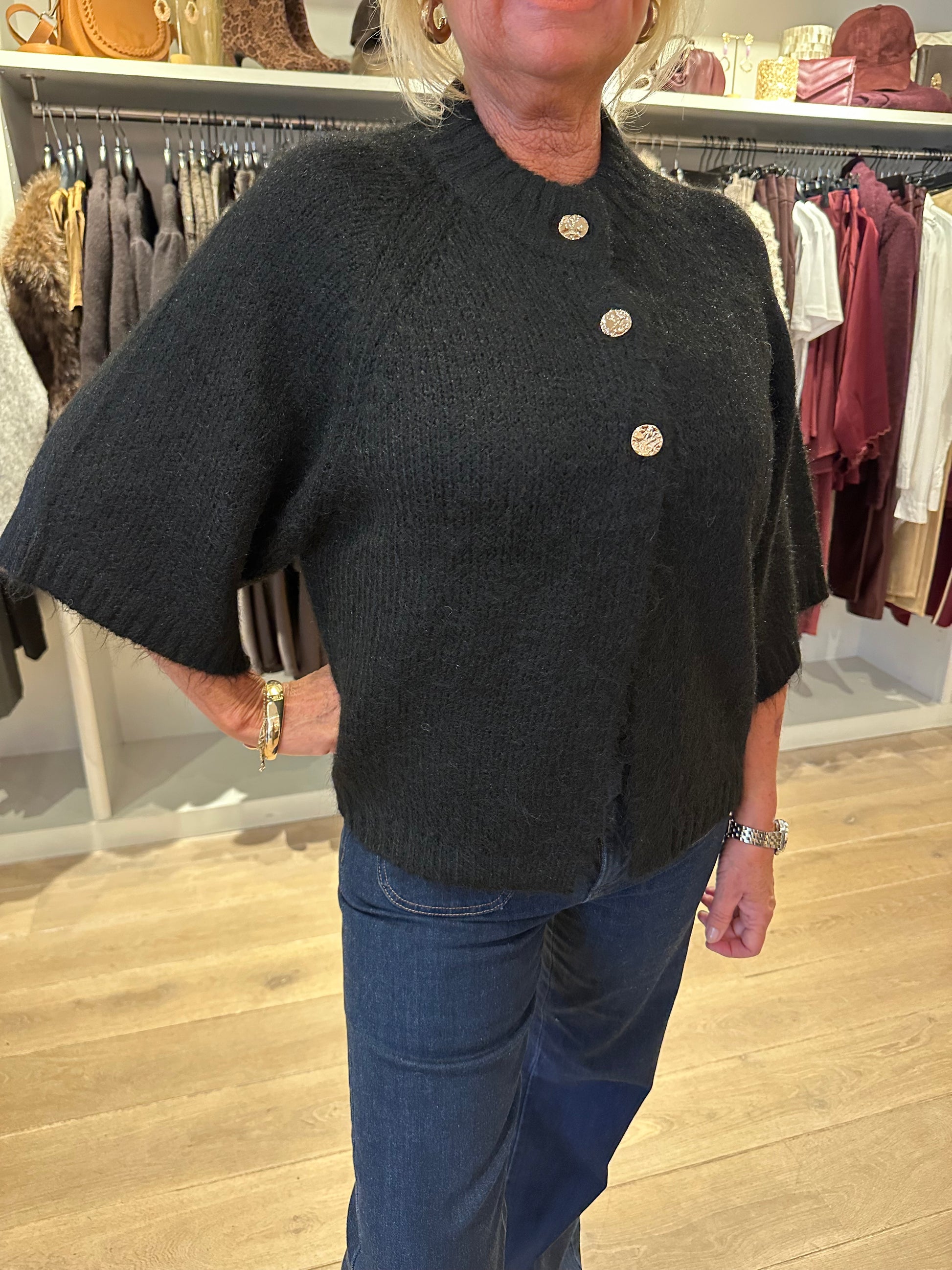 Super leuke cape vest model van Neo Noir. Kleur is zwart met gouden knopen en drie kwart mouw.