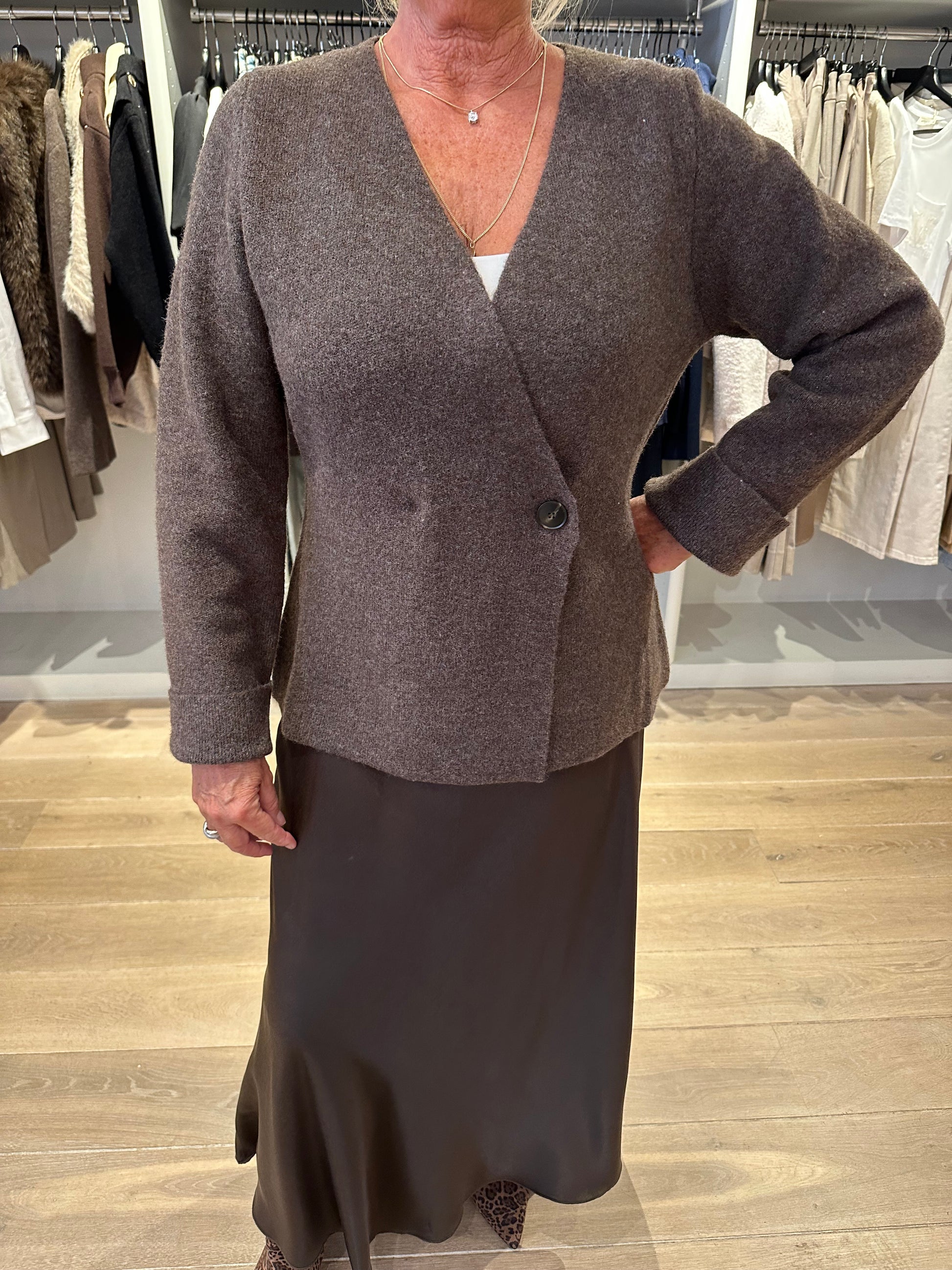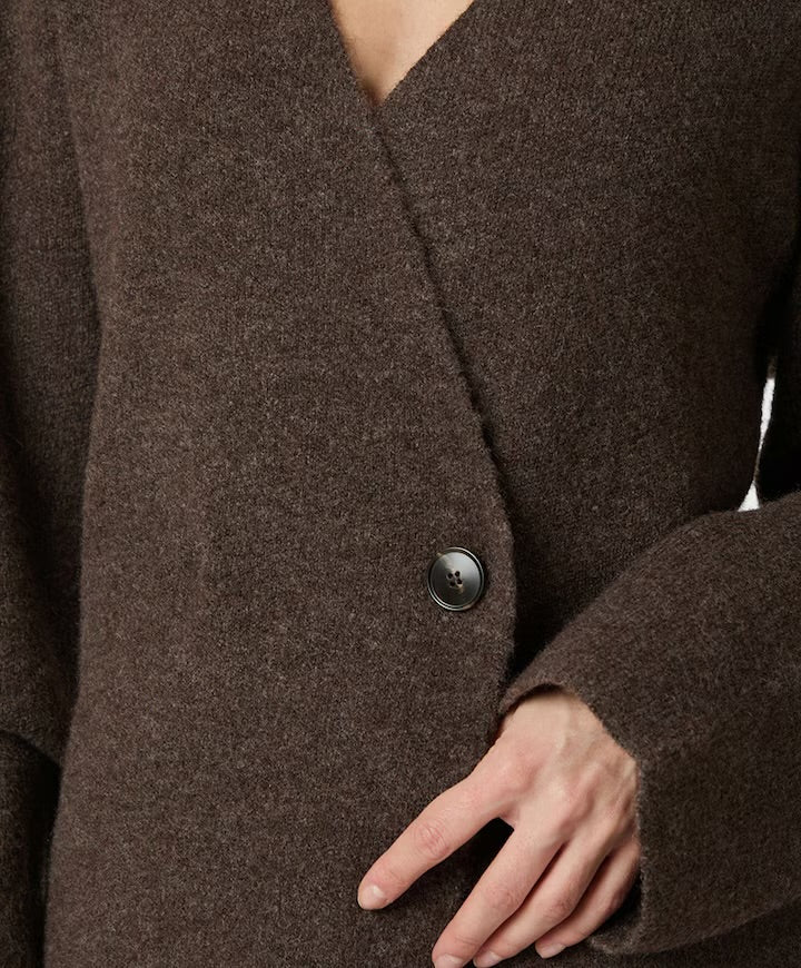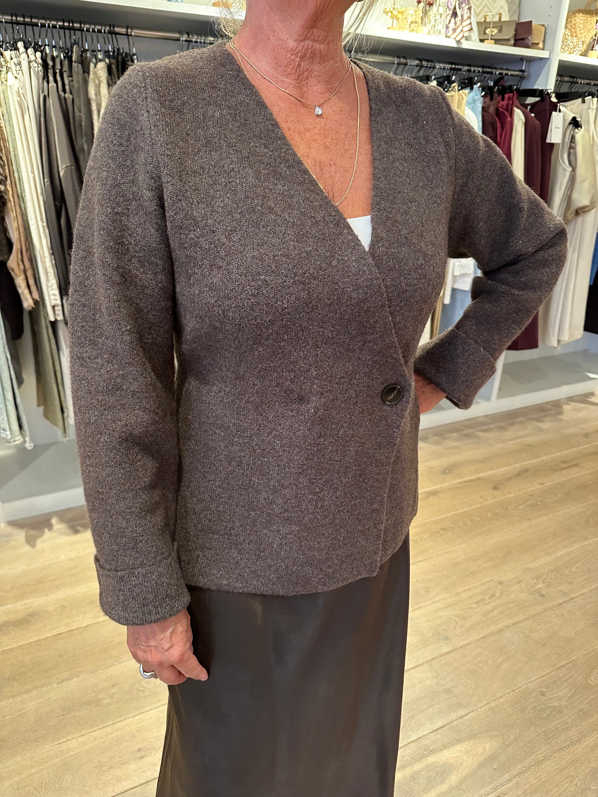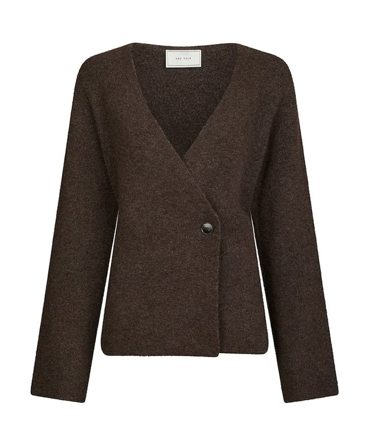Super leuk vest van Neo Noir die ook als trui gedragen kan worden. Mooie donker bruine melee kleur met a symmetrische knoop. Maten vallen normaal.