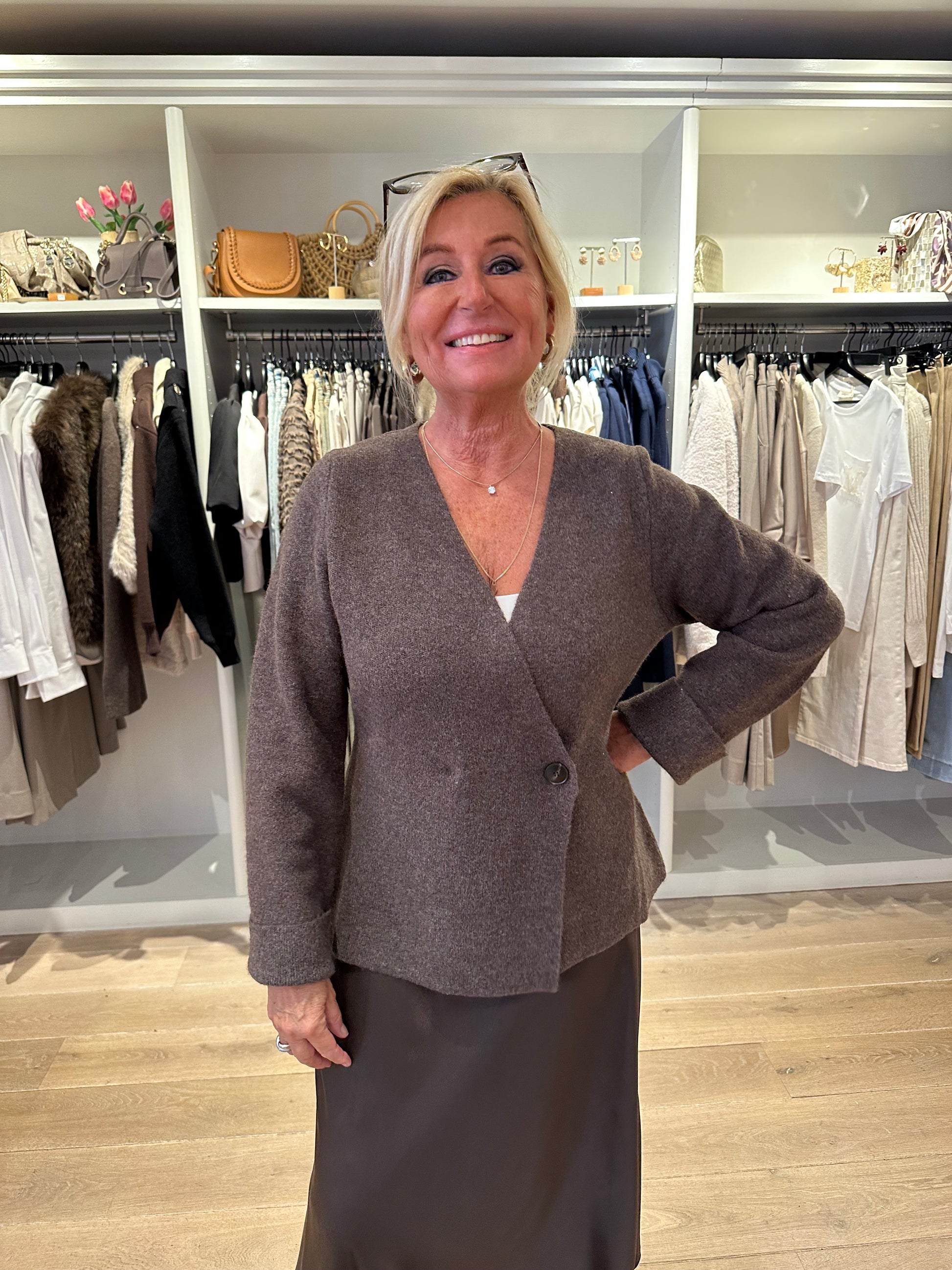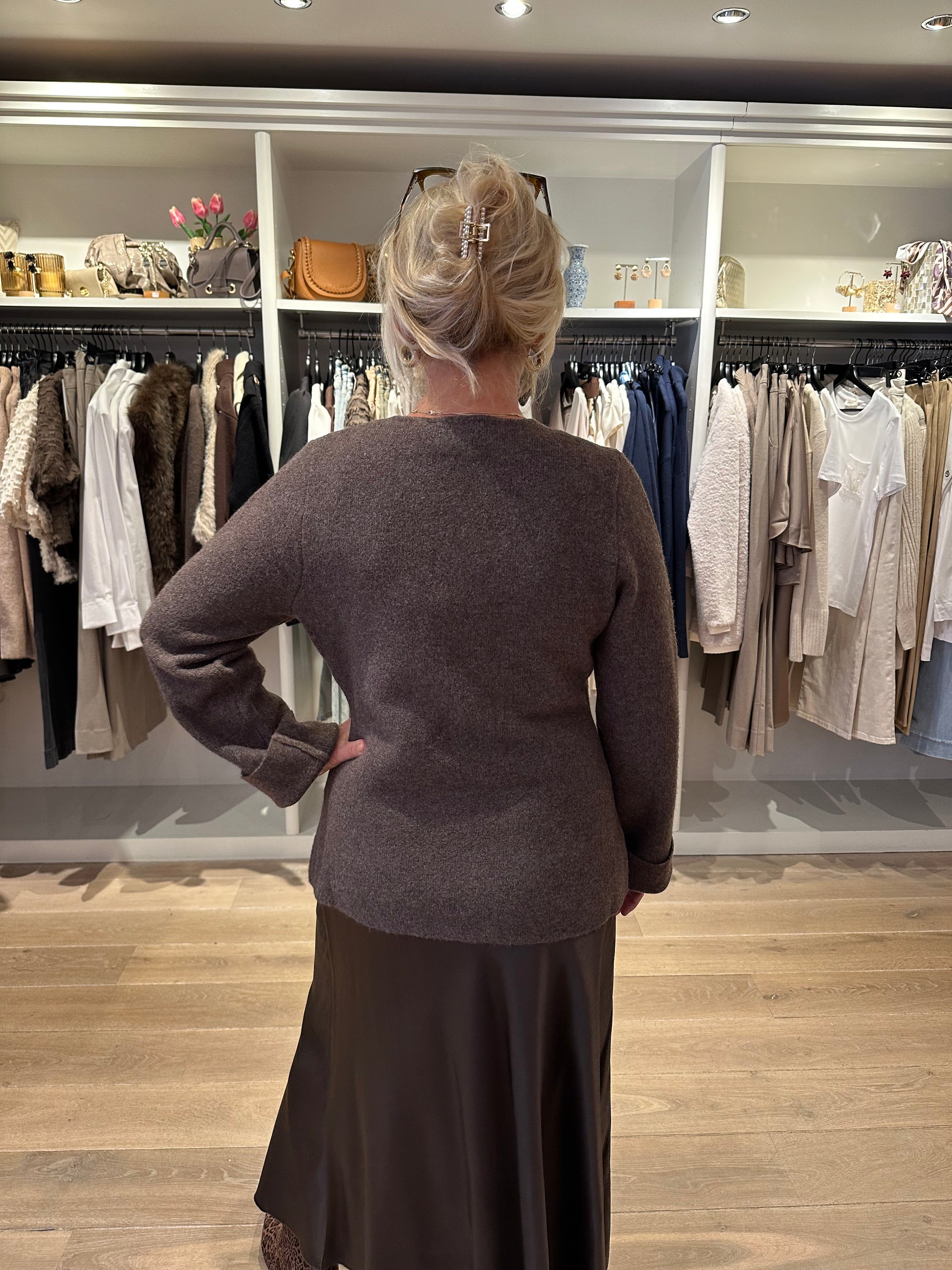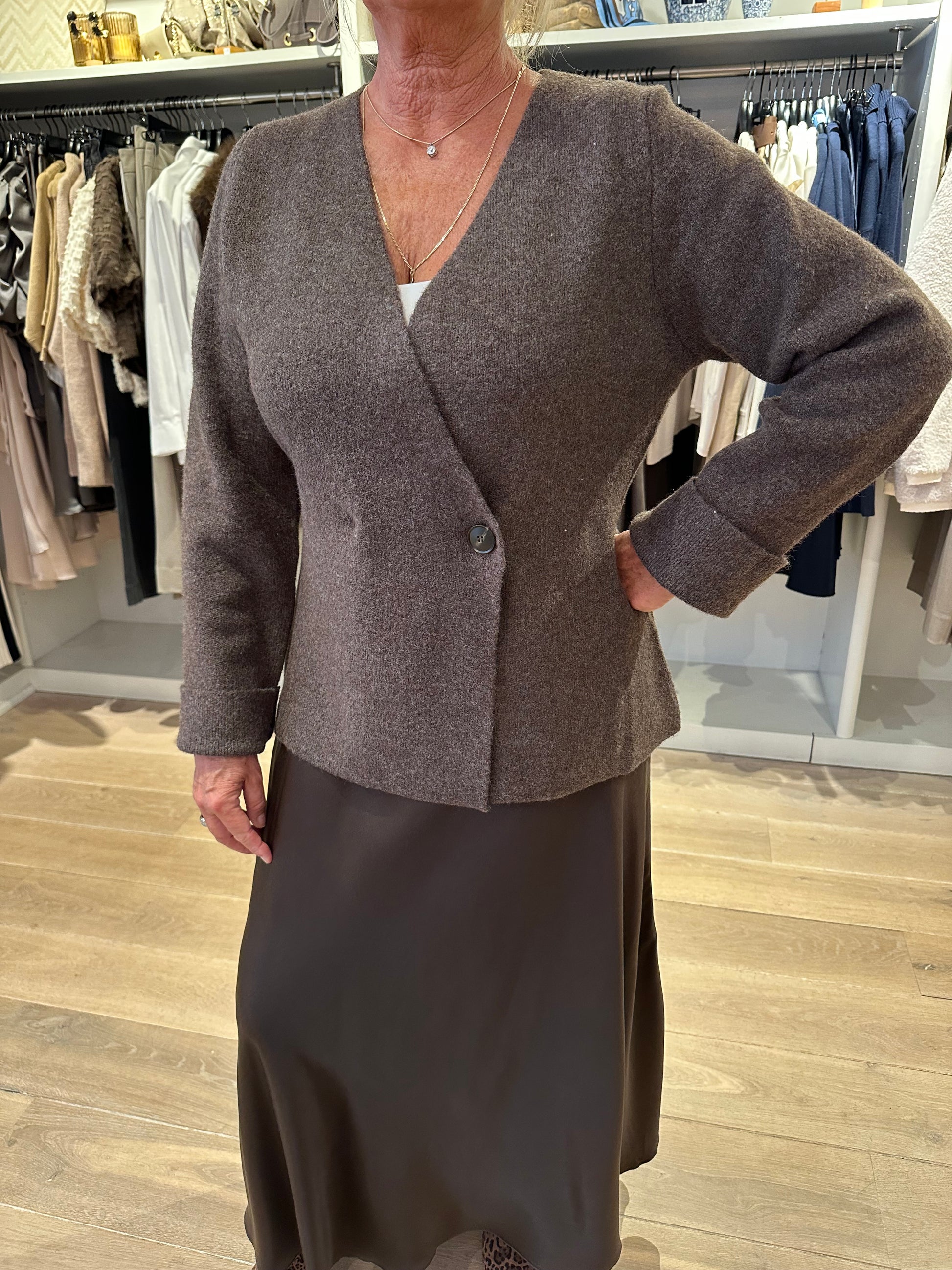 Super leuk vest van Neo Noir die ook als trui gedragen kan worden. Mooie donker bruine melee kleur met a symmetrische knoop. Maten vallen normaal.