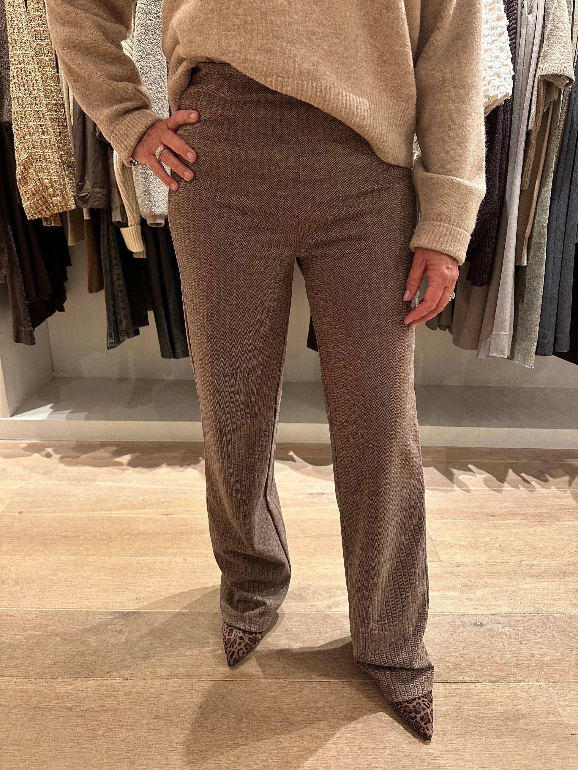 Heerlijke stretch pantalon met elastieke band van het merk soya concept. De broek heeft een subtiele visgraat motief in een camel en antraciet kleur. Maten vallen normaal en zit veel stretch in.