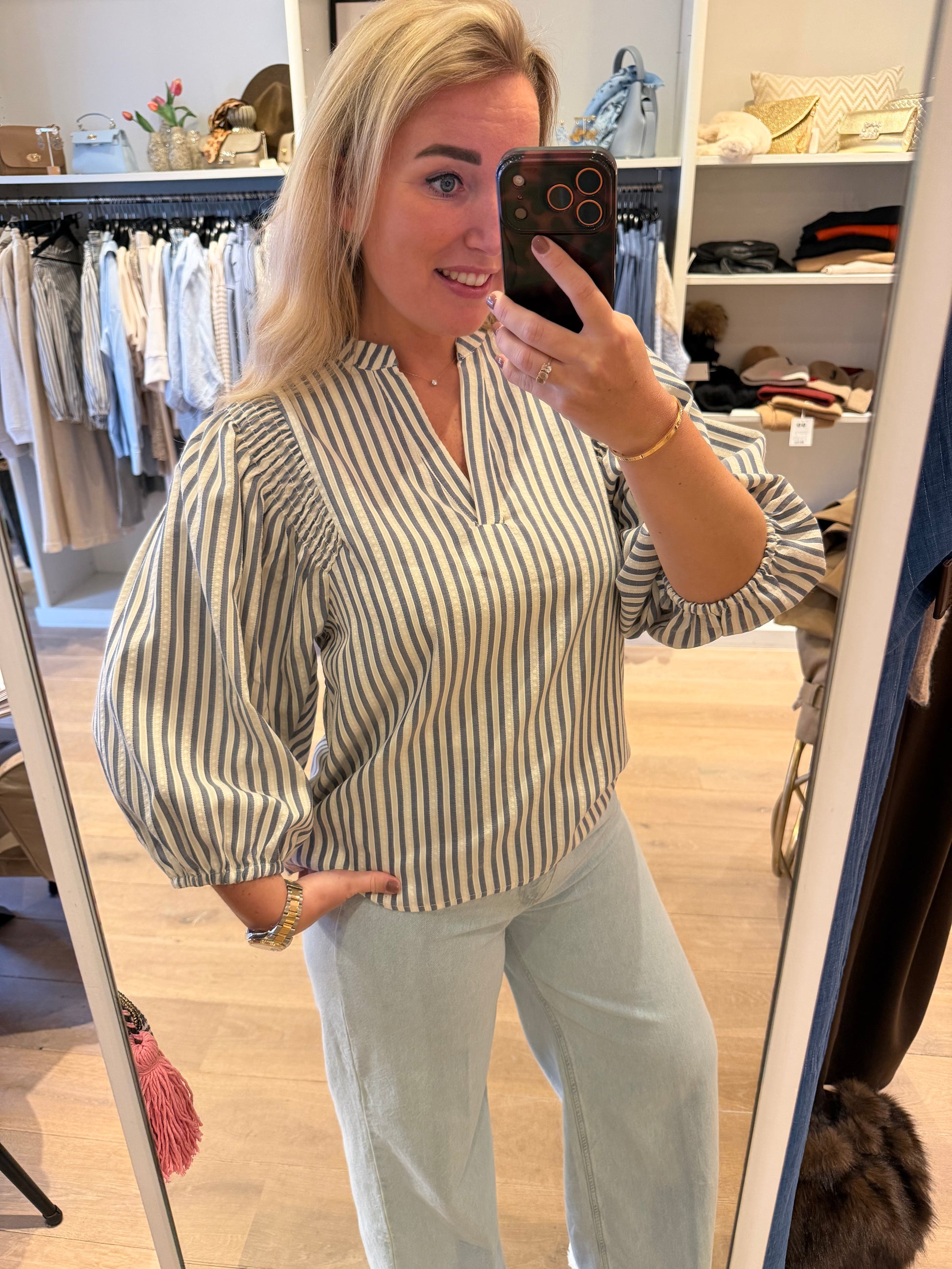 Mooie blouse met leuke details. Blauw wit gestreept en leuke pof mouw.