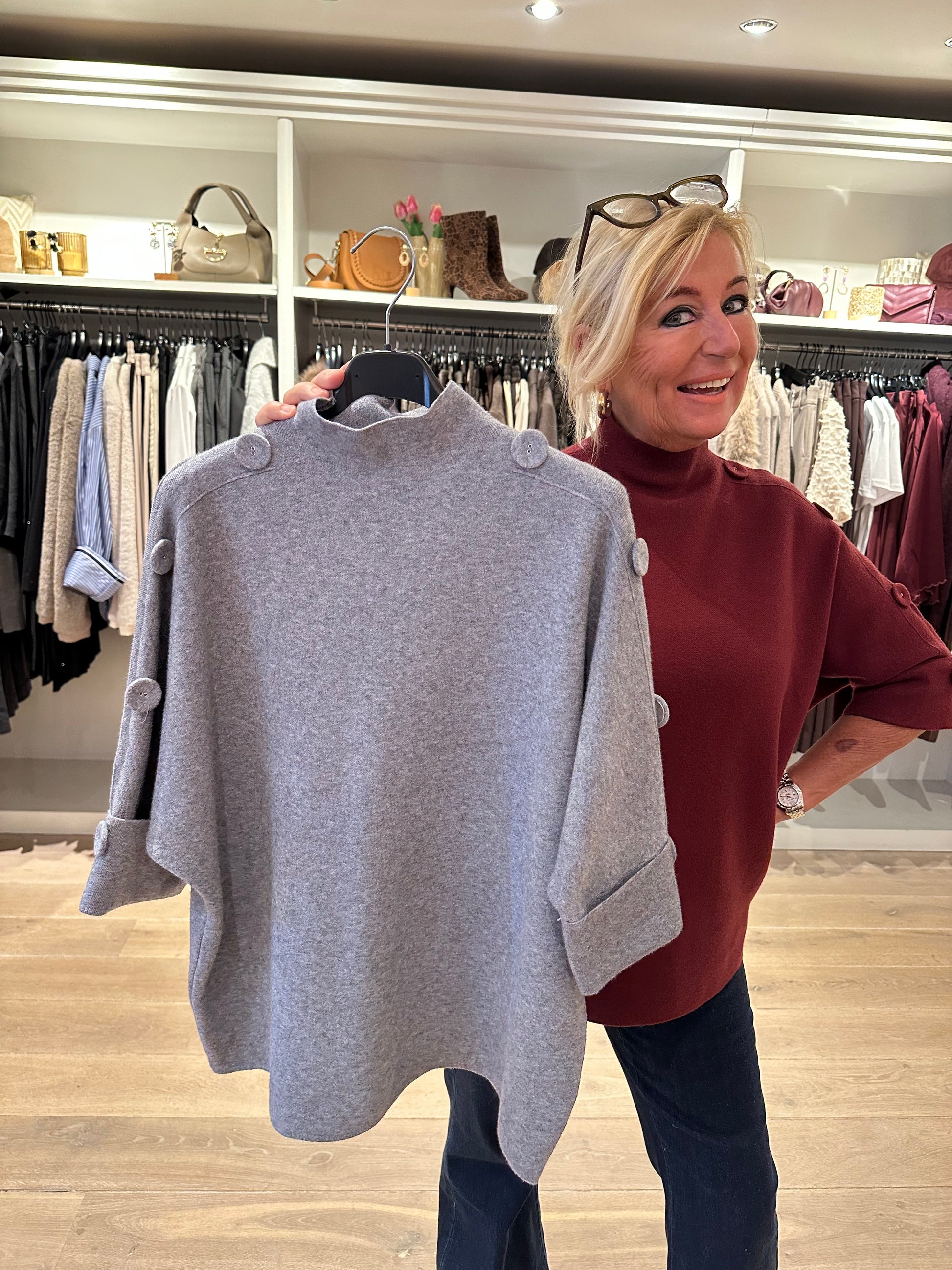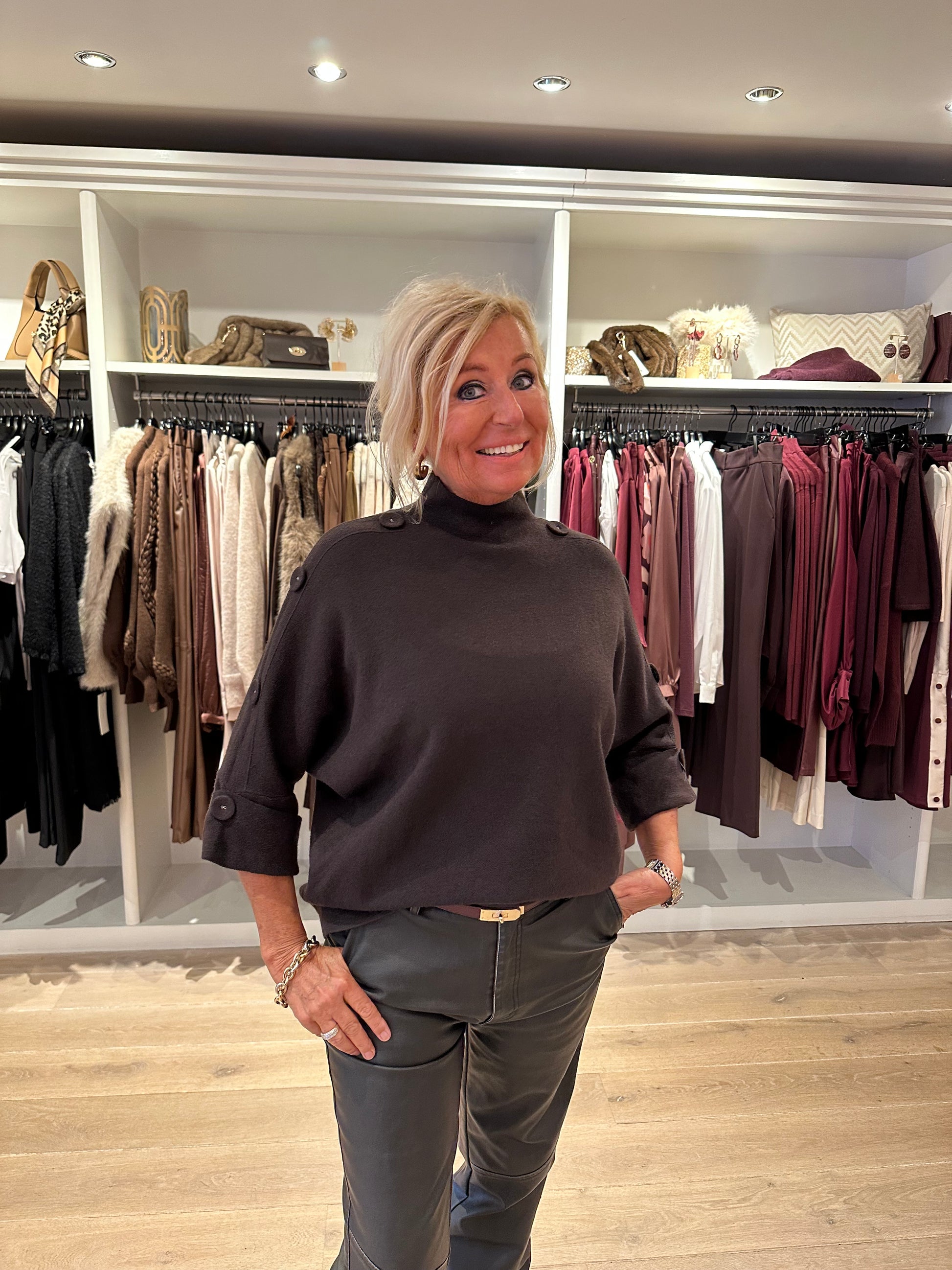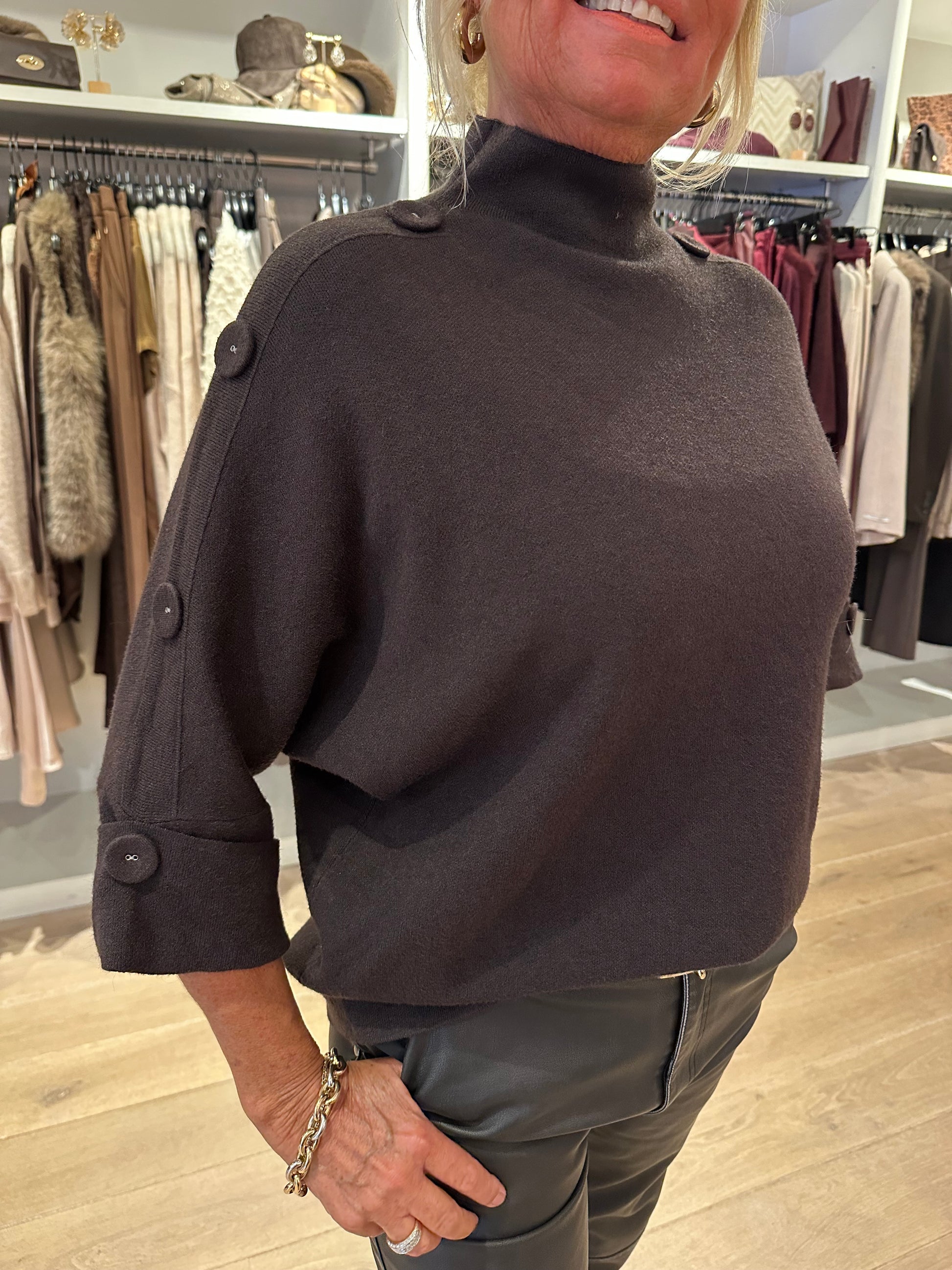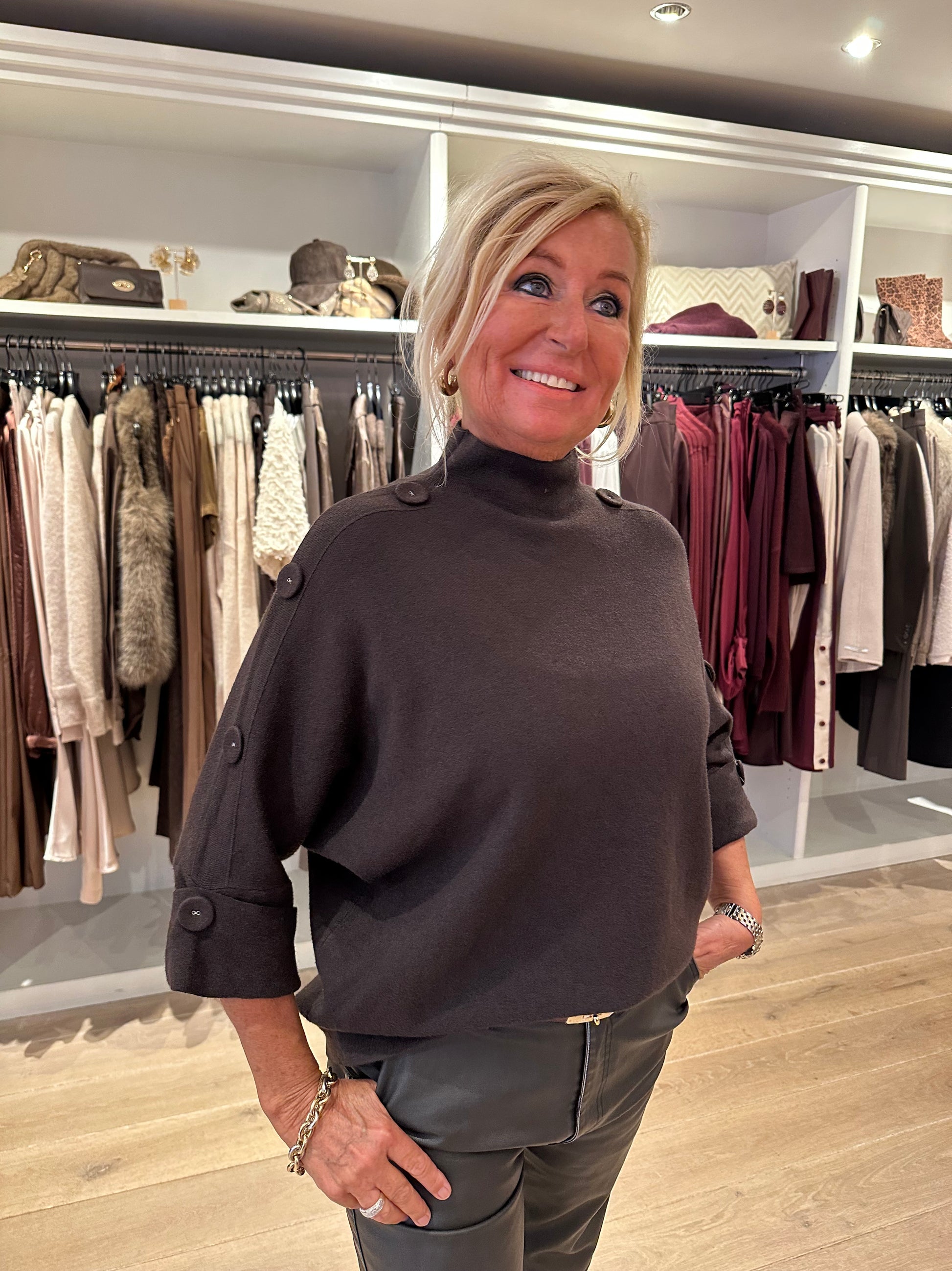 Heerlijke zachte viscose trui! Leuke knoop details op de mouw. One size te dragen tm een ruime 42.