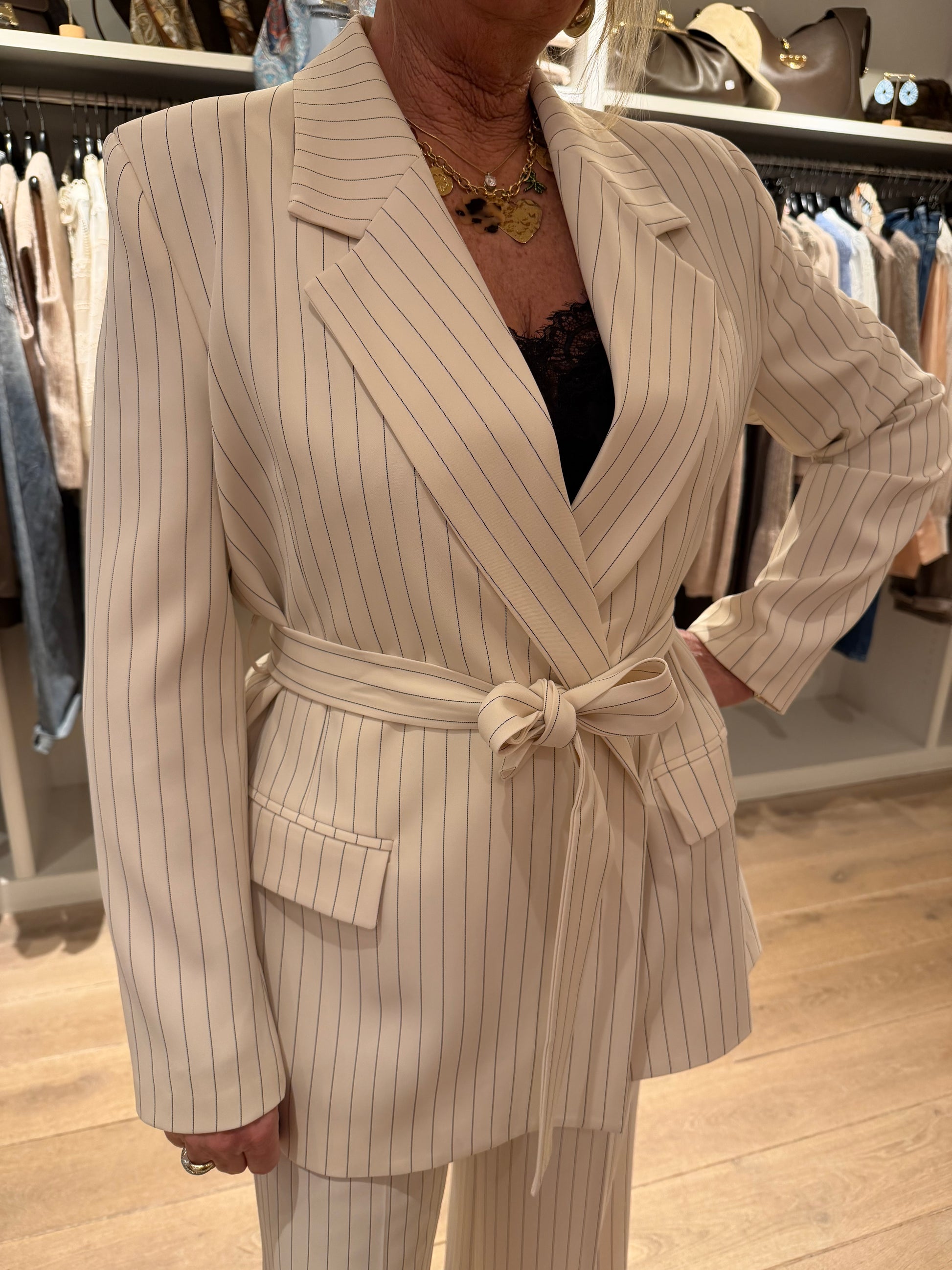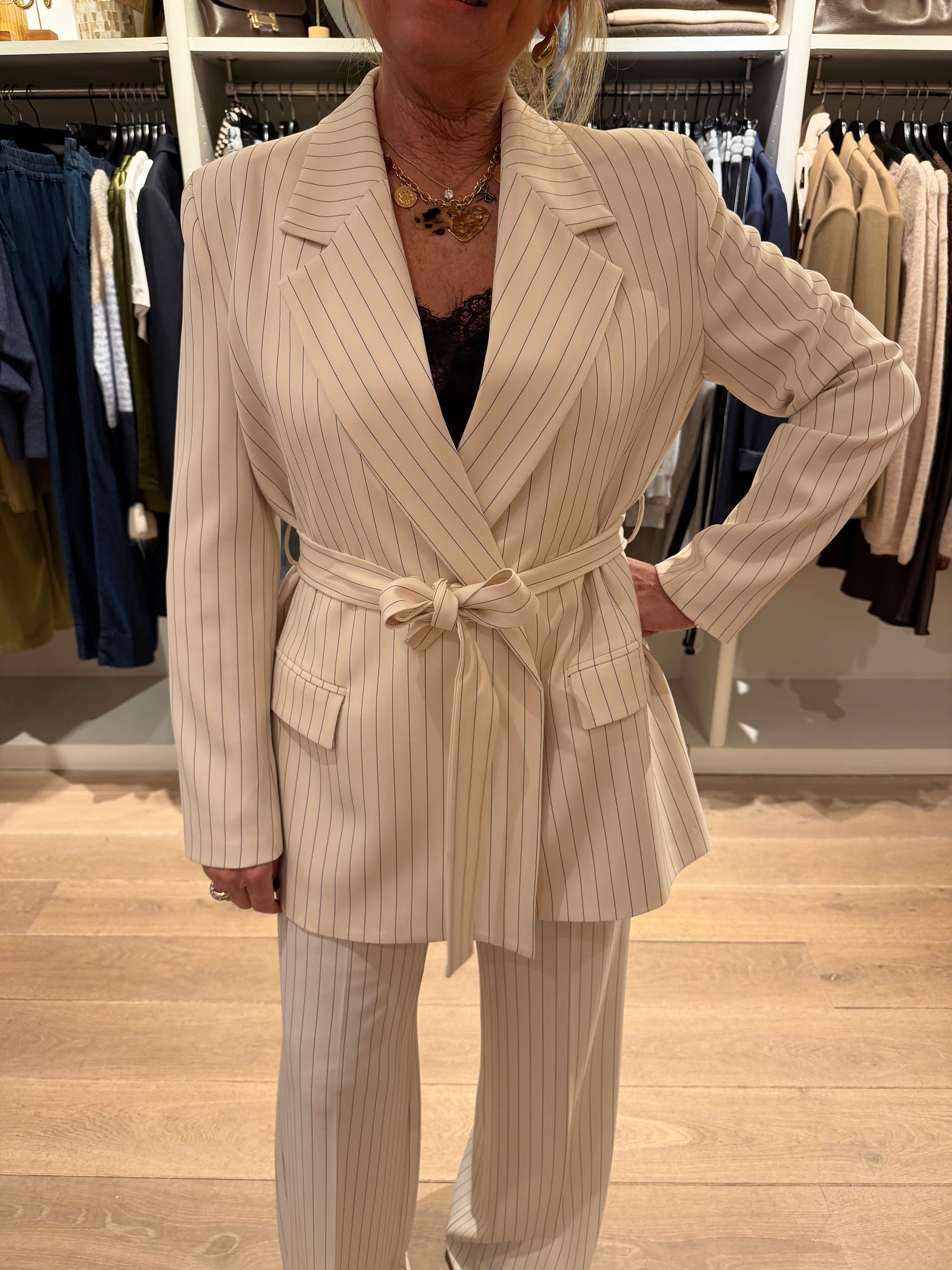 Super leuke blazer met strikceintuur. Mooi te combineren met de bijpassende pantalon. Margaret draagt een maat S.